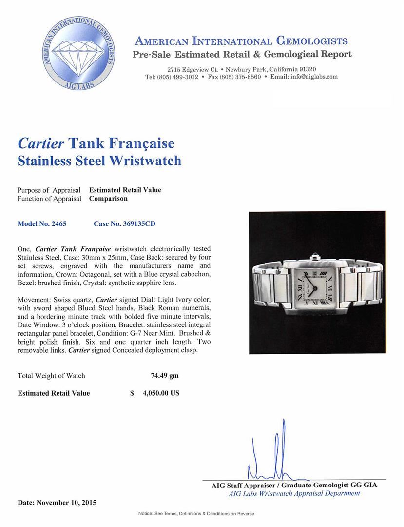 One, Cartier Tank Francaise wristwatch electronically tested Stainless Steel, Case: 30mm x 25mm, Case Back: secured by four set screws, engraved with the manufacturers name and information, Crown: Octagonal, set with a Blue crystal cabochon, Bezel: brushed finish, Crystal: synthetic sapphire lens. Movement: Swiss quartz, Cartier signed Dial: Light Ivory color, with sword shaped Blued Steel hands, Black Roman numerals, and a bordering minute track with bolded five minute intervals, Date Window: 3 o'clock position, Bracelet: stainless steel integral rectangular panel bracelet, Condition: G-7 Near Mint. Brushed & bright polish finish. Six and one quarter inch length. Two removable links. Cartier signed Concealed deployment clasp. Total Weight of Watch 74.49gm. AIG Appraised at $4,050.00.
