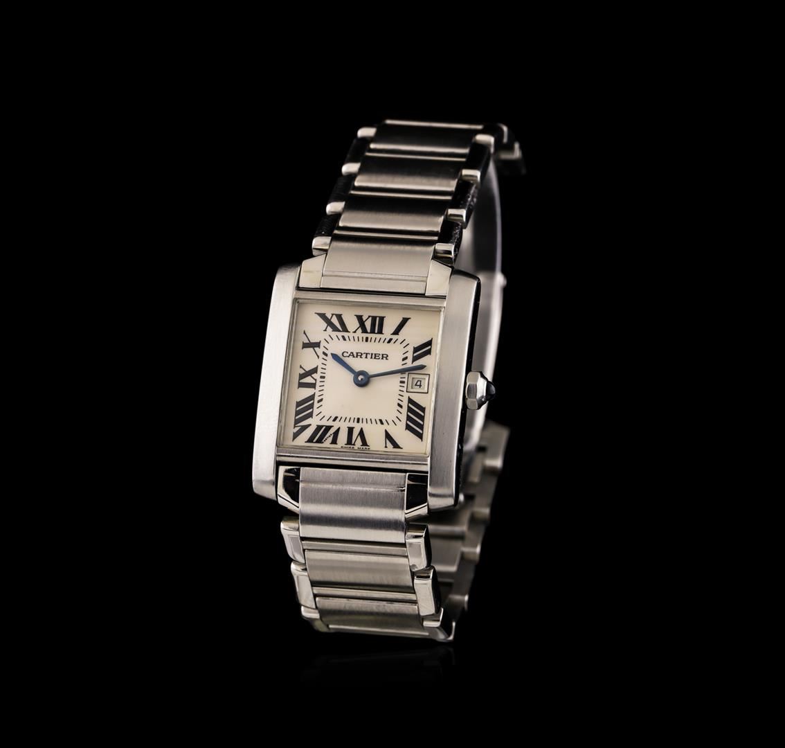 One, Cartier Tank Francaise wristwatch electronically tested Stainless Steel, Case: 30 x 25mm, Case Back: secured by four set screws, engraved with the manufacturers name and information, Crown: Octagonal, set with a Blue crystal cabochon, Bezel: brushed finish, Crystal: synthetic sapphire lens. Movement: Swiss quartz, Cartier signed Dial: Ivory color, with sword shaped Blued Steel hands, Roman numerals, and a bordering minute track with bolded five minute intervals, Date Window: 3 o'clock position. Cartier Bracelet: stainless steel integral rectangular panel links, Condition: G-7 Near Mint. Brushed & bright polish finish. Six and one quarter inch length. Two removable links. Cartier signed Concealed deployment clasp. Total Weight of Watch 74.88gm. AIG Appraised at $3,880.00.