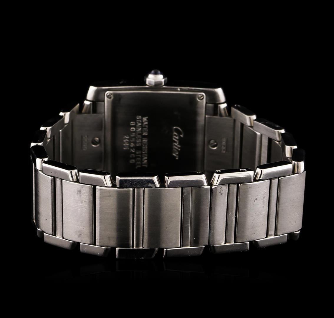 One, Cartier Tank Francaise wristwatch electronically tested Stainless Steel, Case: 30 x 25mm, Case Back: secured by four set screws, engraved with the manufacturers name and information, Crown: Octagonal, set with a Blue crystal cabochon, Bezel: brushed finish, Crystal: synthetic sapphire lens. Movement: Swiss quartz, Cartier signed Dial: Ivory color, with sword shaped Blued Steel hands, Roman numerals, and a bordering minute track with bolded five minute intervals, Date Window: 3 o'clock position. Cartier Bracelet: stainless steel integral rectangular panel links, Condition: G-7 Near Mint. Brushed & bright polish finish. Six and one quarter inch length. Two removable links. Cartier signed Concealed deployment clasp. Total Weight of Watch 74.88gm. AIG Appraised at $3,880.00.