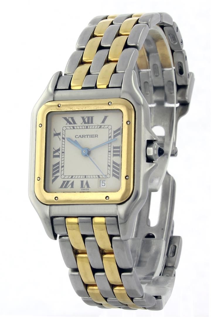 One Ladies Yellow Gold & Stainless Steel Panthere, Serviced & Electronically Tested, Case:27mm, Stainless Steel Crown, Bezel: 18K Yellow Gold Bezel, Crystal: Sapphire Lens. Movement: Quartz Movement. Dial: White Dial With Roman Hour Markers Date Window at 5'O Clock Position. Model#183949 Condition: G-6 Extra Fine. Bracelet: 18K Yellow Gold & Stainless Steel 6.0 Inch Length, Adjustable. Standard Clasp.