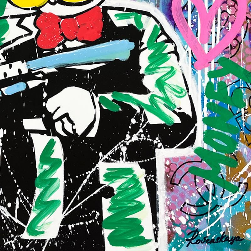 "Cash Out" is a one-of-a-kind mixed media on deckle edge paper by Nastya Rovenskaya; hand signed by the artist. This piece comes custom framed and includes letter of authenticity. Measures approximately 30" x 36.5" (framed), 24" x 30.5" (image).