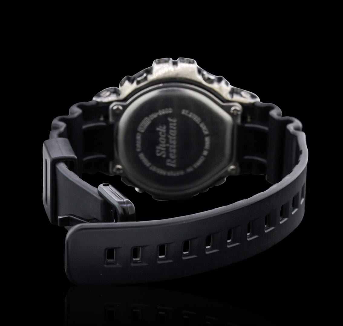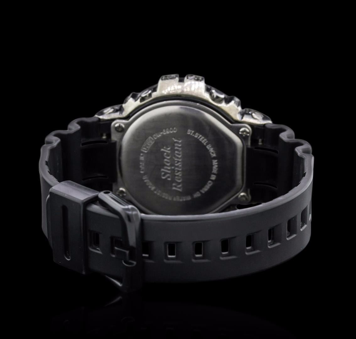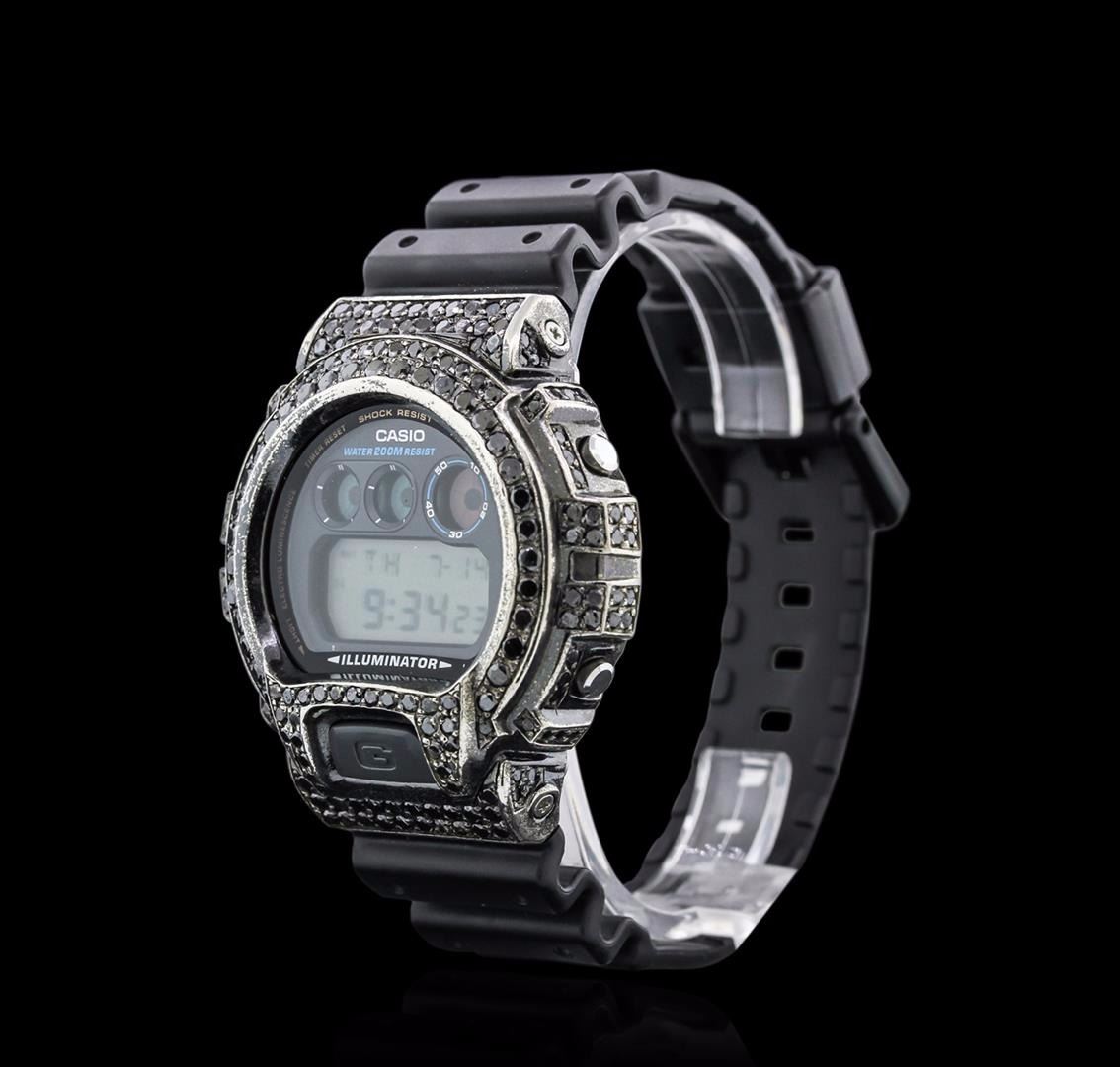 One Casio stainless steel with black PVD coating G-Shock watch accented with black diamonds and completed with a rubber strap.