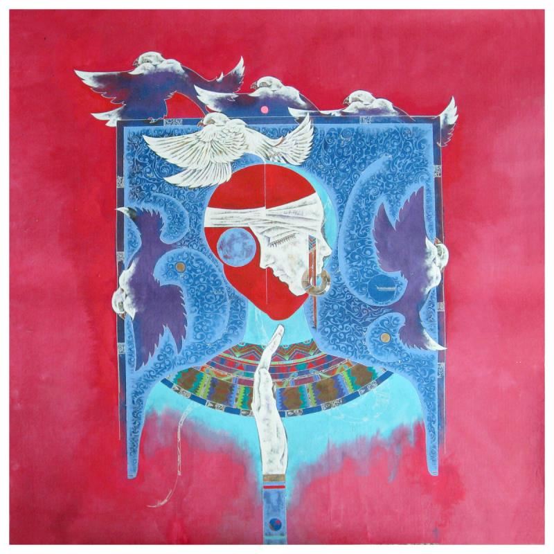 "Cassandra 02 (2003)" is an original mixed media painting on paper by Lu Hong. Hand signed by the artist, the piece comes with a letter of authenticity. Measures approximately 35" x 34.5".