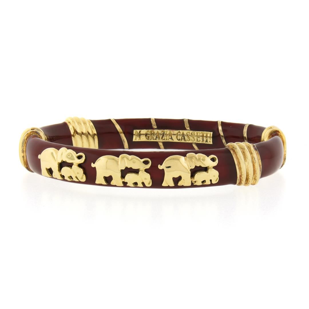A solid 18k yellow gold elephants bangle bracelet by Cassetti, with red enamel work. It weighs a total of 35.16 grams, measures 12.40mm wide, and measures 6.75 inches in length.