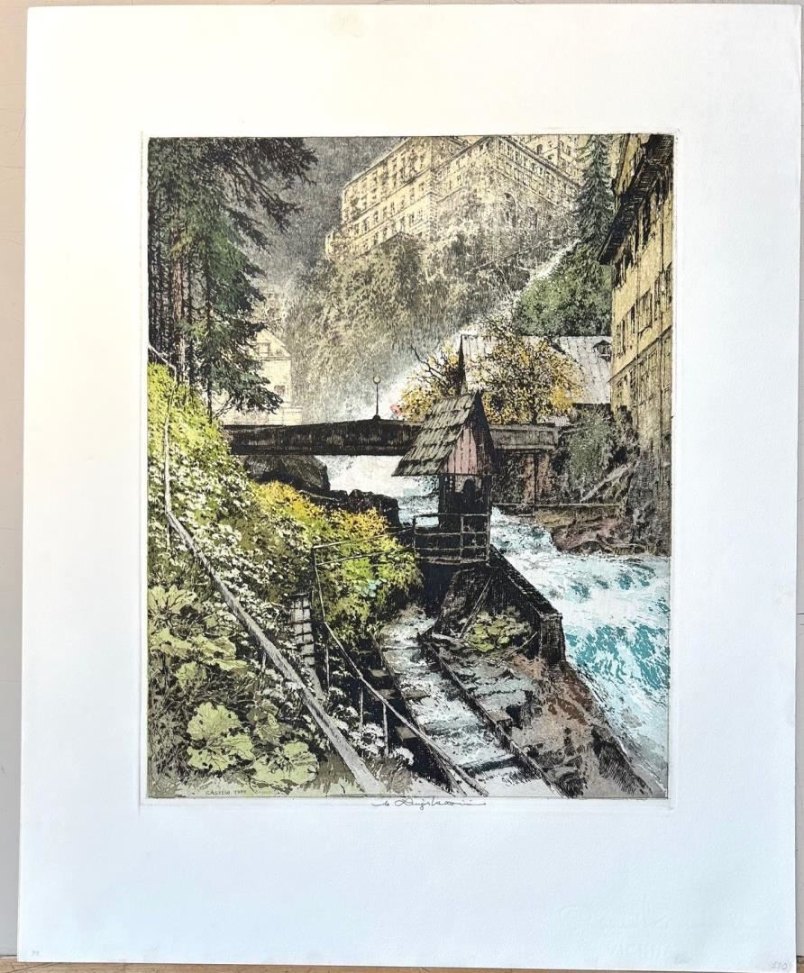 A charming hand-colored etching of the Castein by Luigi Kasimir signed & numbered 84/100. 14x15.75" image on 19.25x27.25" arches paper