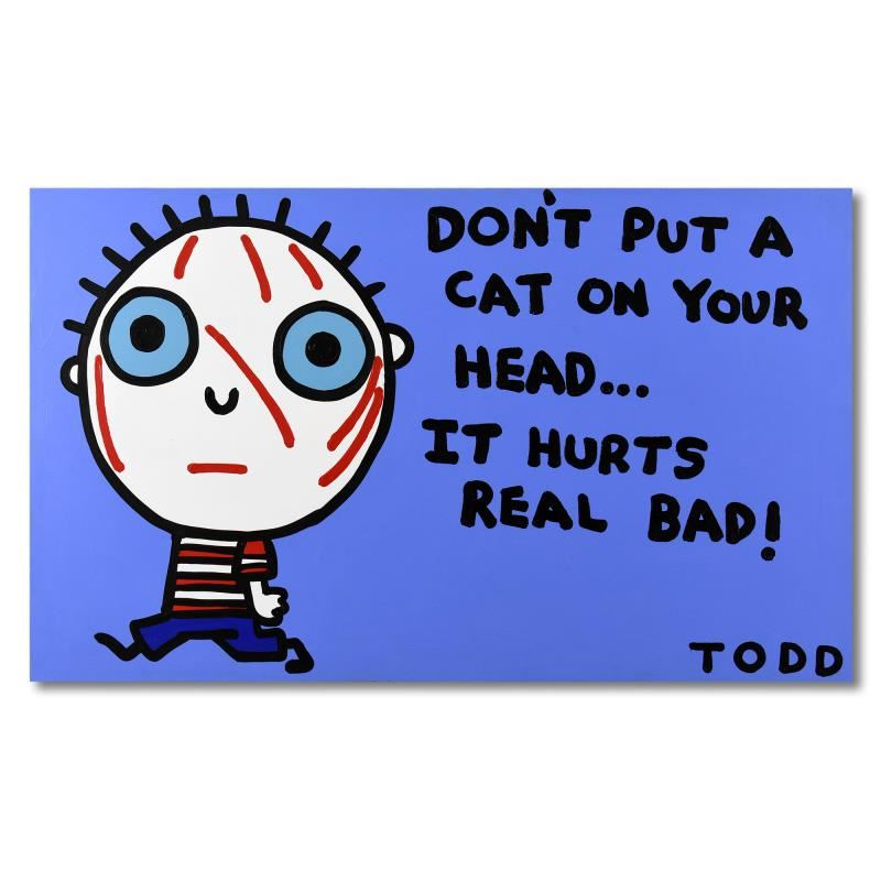 "Cat On Your Head" is an original acrylic painting on canvas by Todd Goldman, hand signed by the artist. This piece comes gallery wrapped. Includes Letter of Authenticity. Measures approx. 60" x 36" (image). ** Please note: There is minor wear on the corners and edges of this piece, as well as minor scuffs. **