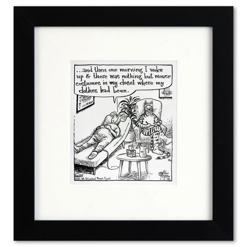 Enter a surreal and satirical world of twisted imagination and award winning creativity. "Cat and Mouse Therapy" is an original pen & ink drawing on paper by Dan Piraro, creator of the critically acclaimed and award winning comic strip, Bizarro. This piece is hand signed, comes custom framed and includes a letter of authenticity. Measures approximately 12" x 11" (frame), 7" x 6" (image).This item requires special handling and may have a longer than usual turnaround.