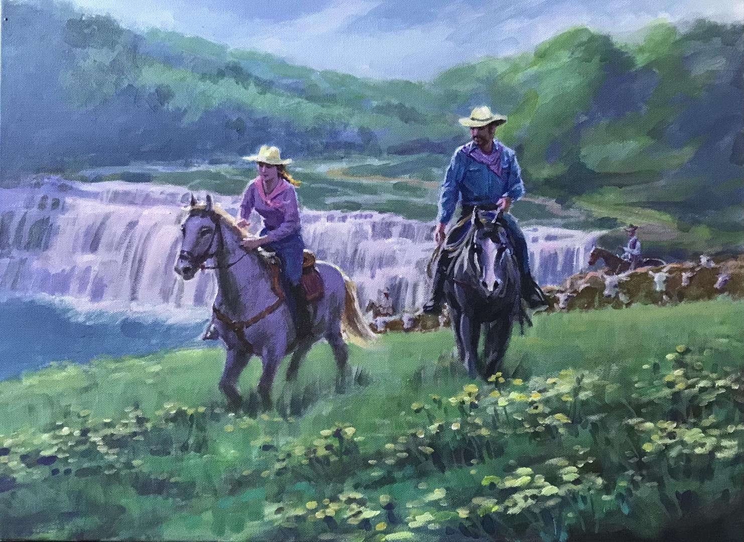 Riders at Lechworth in Upstate New York. An original acrylic on 18x24" stretched canvas by American artist Richard Ho, w/COA.