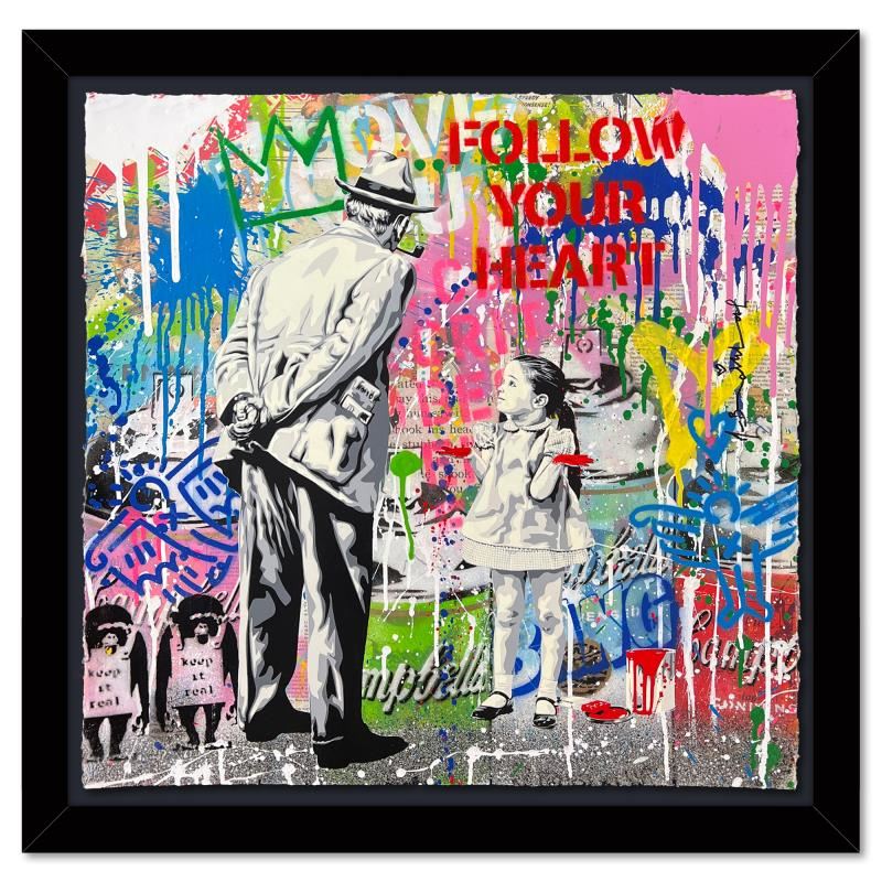 "Caught Red Handed" is a mixed media original on deckle edge paper by Mr. Brainwash, hand signed inverso and bearing the thumbprint of the artist. This piece comes custom framed. Includes Certificate of Authenticity. Measures approx. 26" x 26" (frame), 22" x 22" (image).