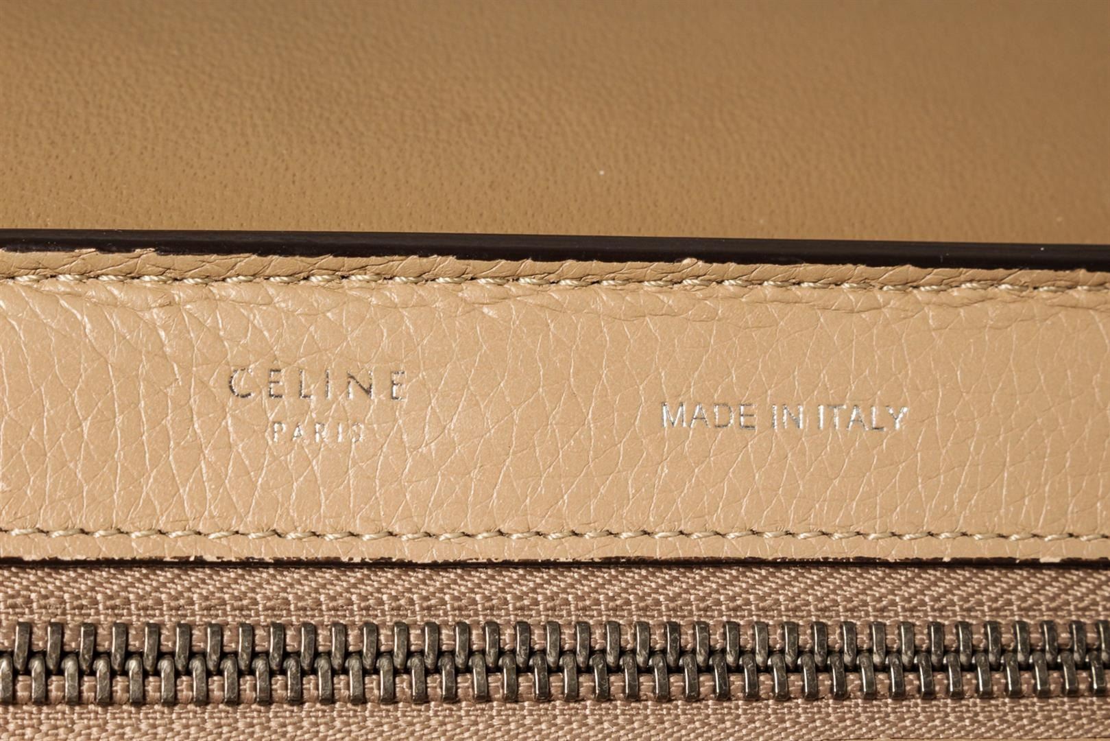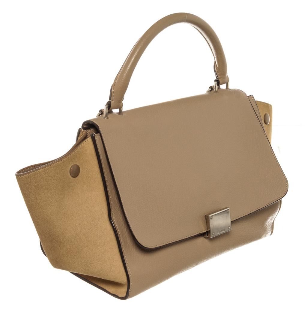 One Celine Beige Leather Suede Trapeze Two-Way Bag. Item is sold AS-IS. All available information is listed in the description and shown in the photo. Beige leather and suede Celine Trapeze 2way bag with silver-tone hardware, single rolled top handle, dual side gussets with snap expansions, exterior zip pocket at back, tonal leather lining, dual interior slit pockets and flip-lock closure at front flap. Detachable shoulder strap. Base L:10.5" Top L:18" W:6" H:8" HD:4"