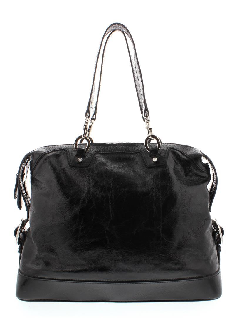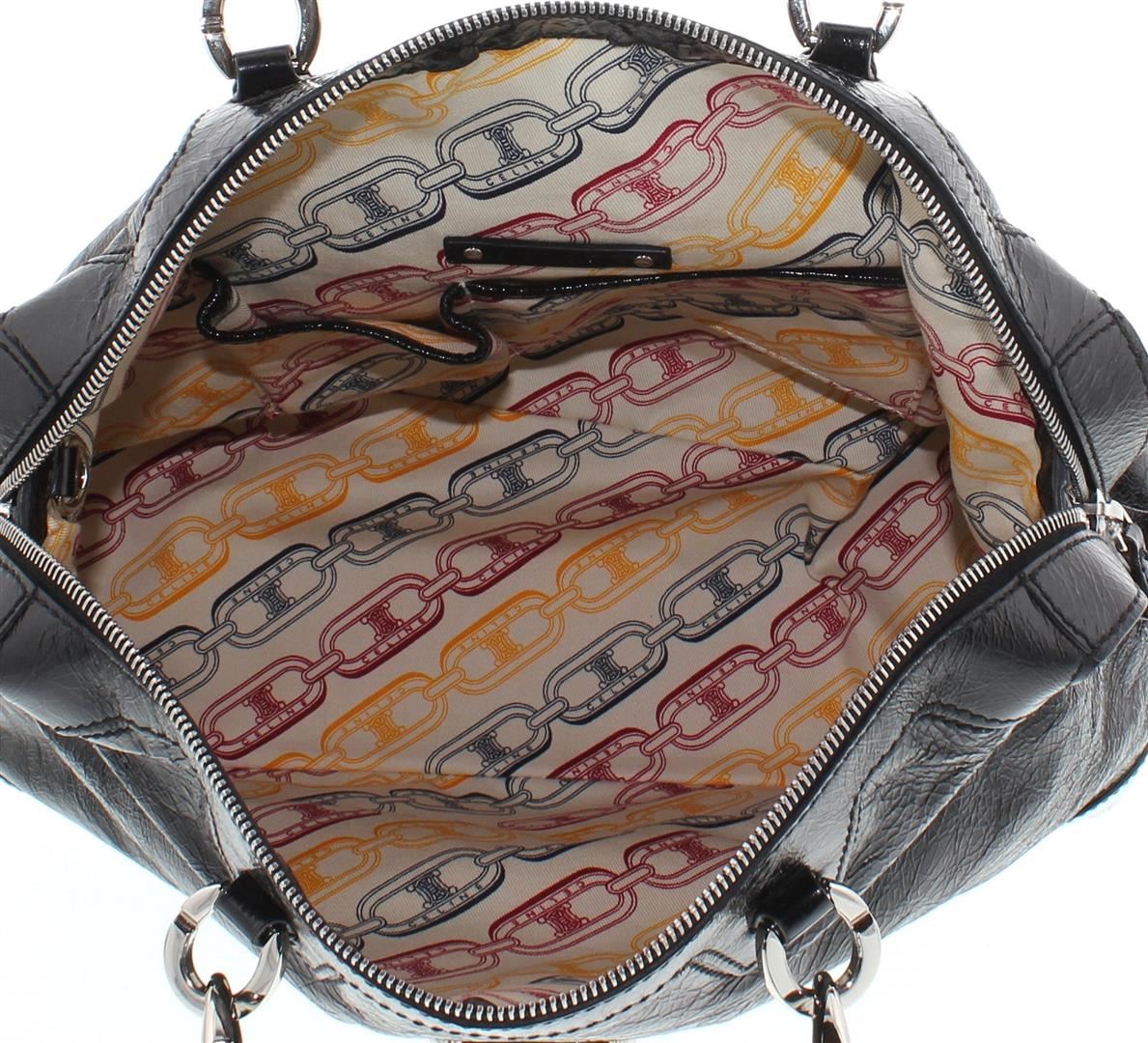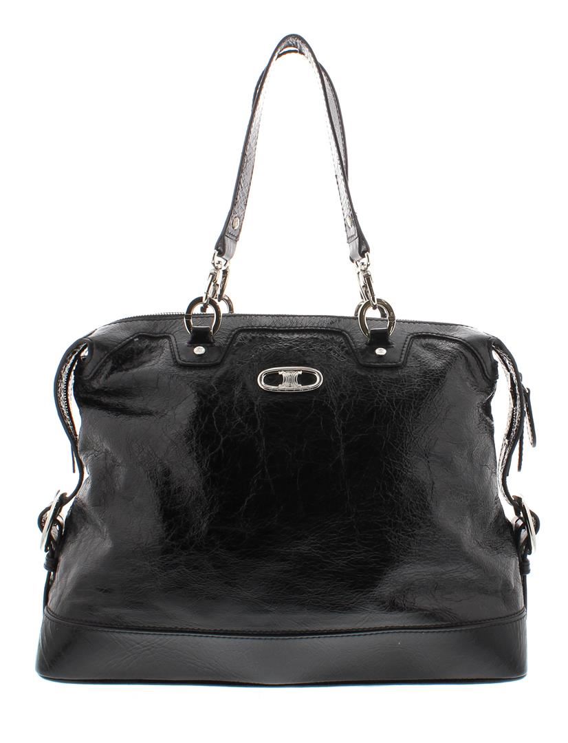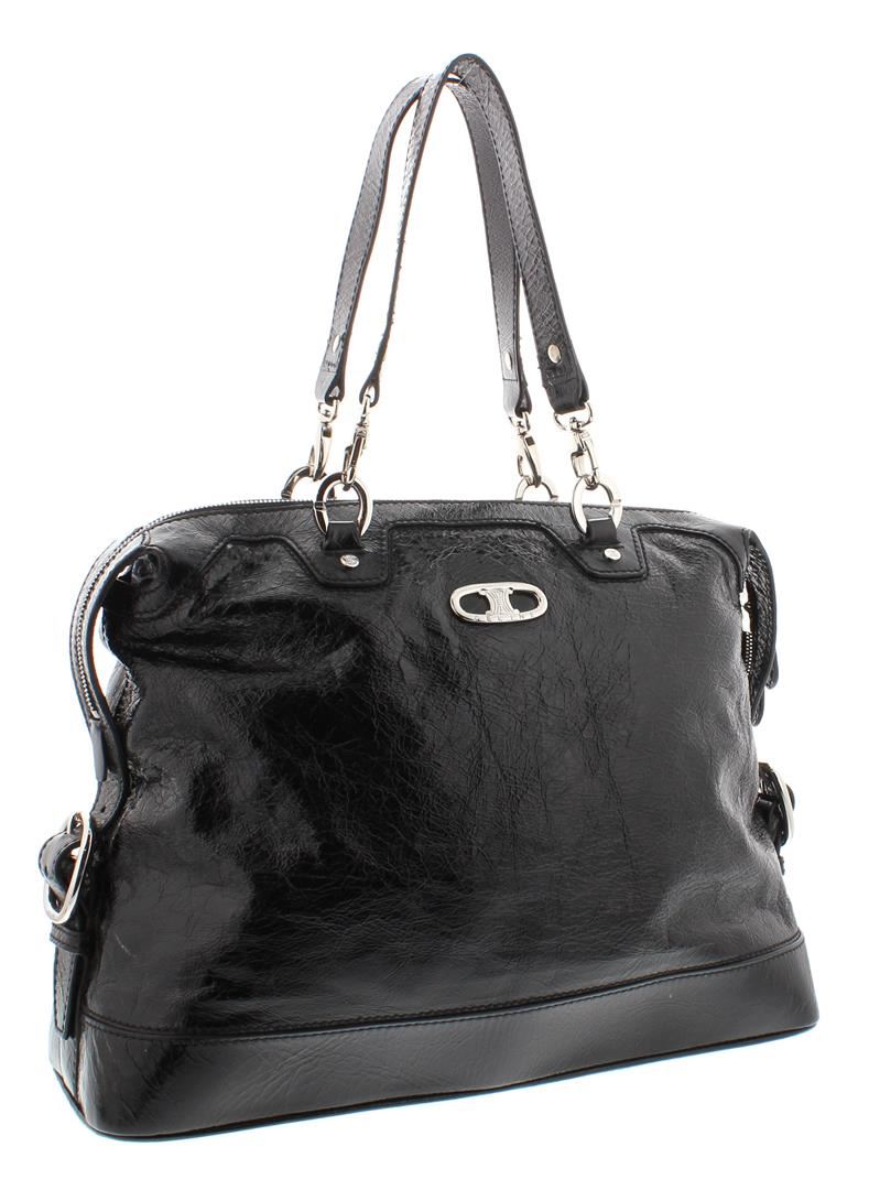 One Celine Black Distressed Patent Leather Shoulder Handbag. Item is sold AS-IS. Please check photos and descriptions for all available details. Crafted out of black distressed patent leather, silver-tone hardware, dual flat shoulder handles, and zip top closure, Inner multicolor Celine logo canvas lining and dual slip pockets.