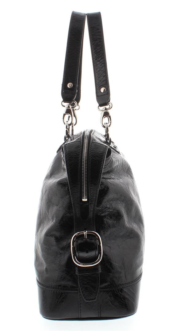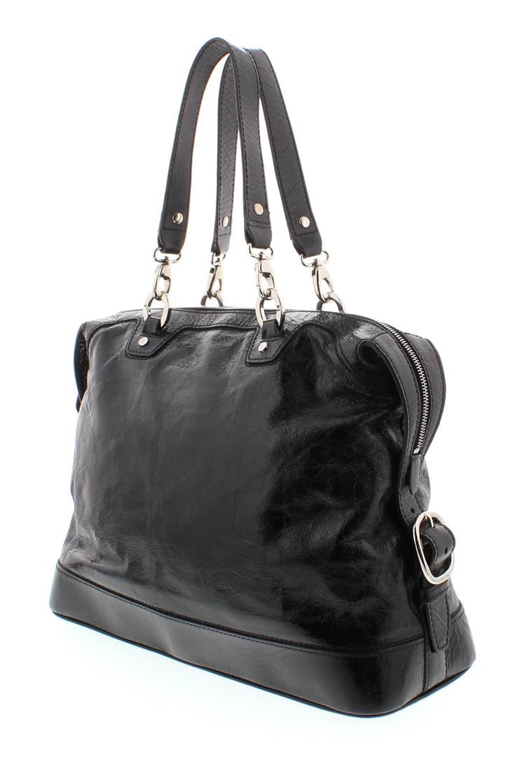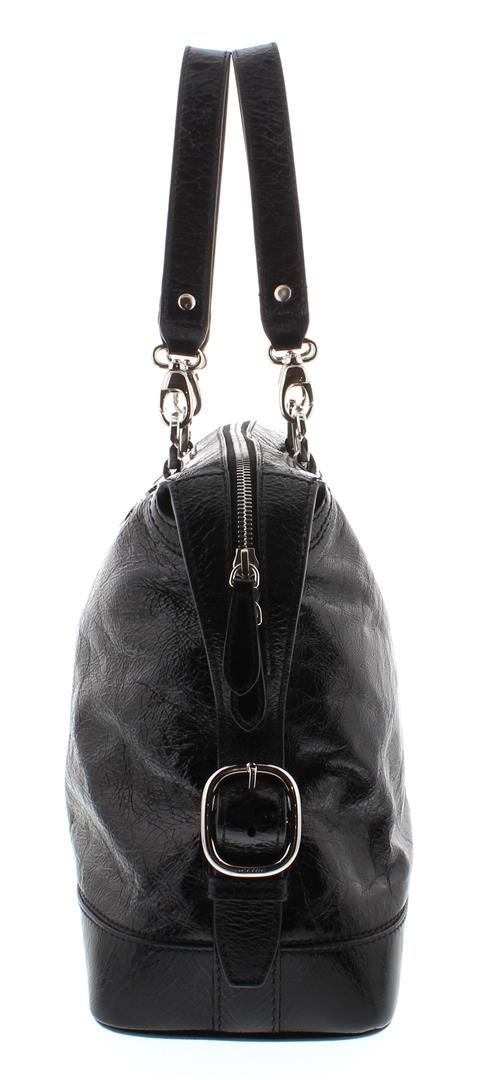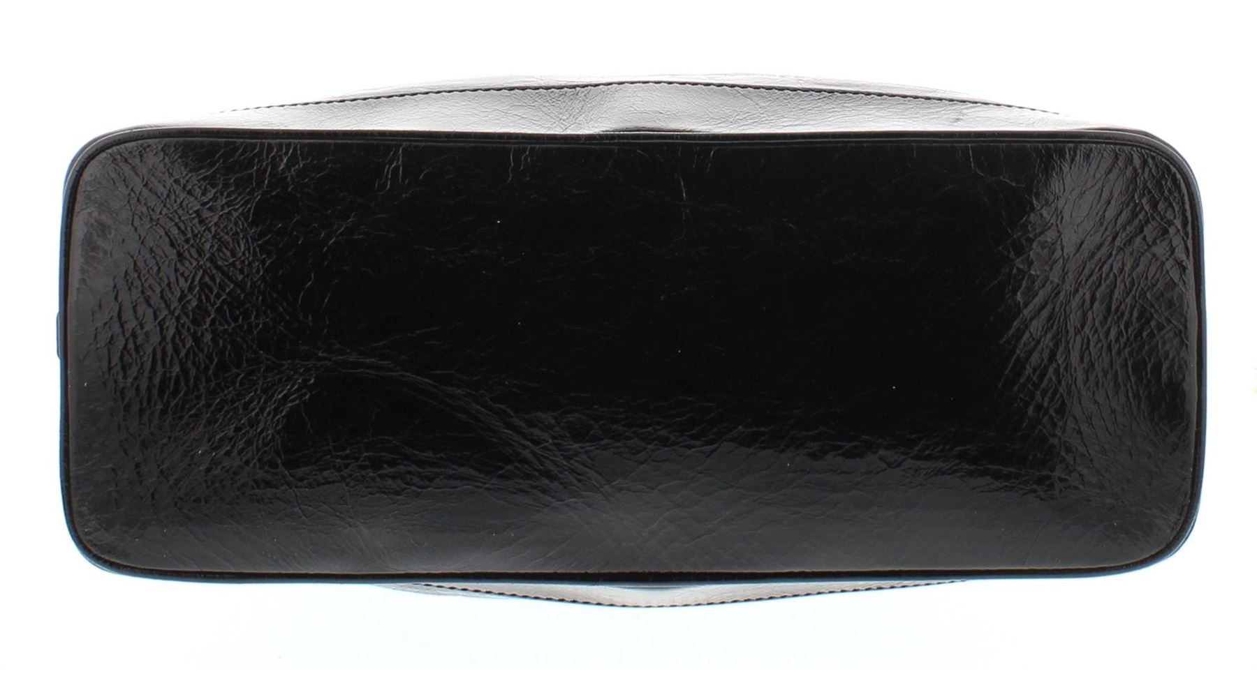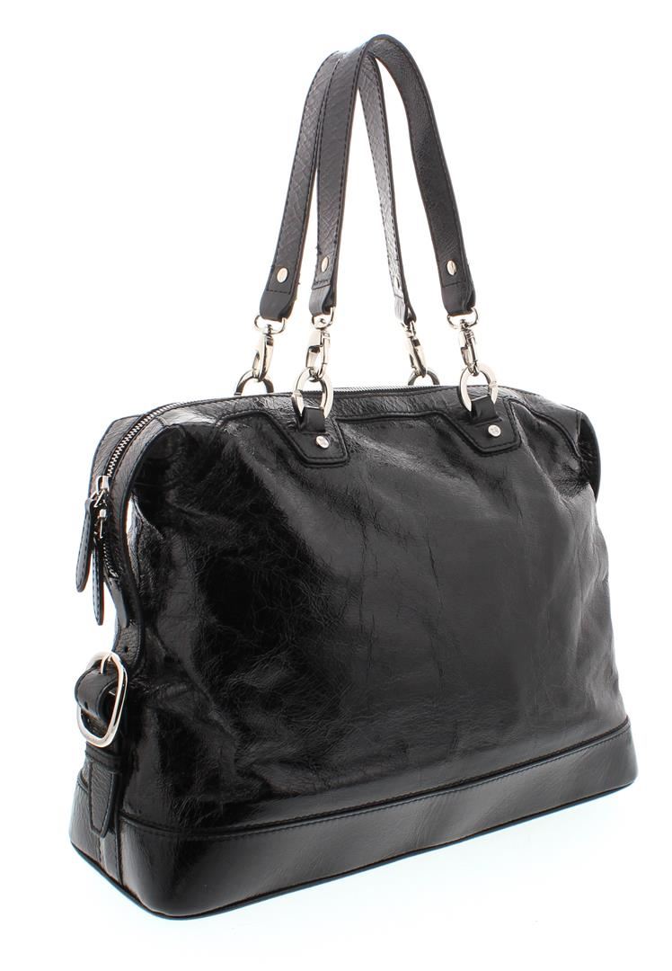 One Celine Black Distressed Patent Leather Shoulder Handbag. Item is sold AS-IS. Please check photos and descriptions for all available details. Crafted out of black distressed patent leather, silver-tone hardware, dual flat shoulder handles, and zip top closure, Inner multicolor Celine logo canvas lining and dual slip pockets.