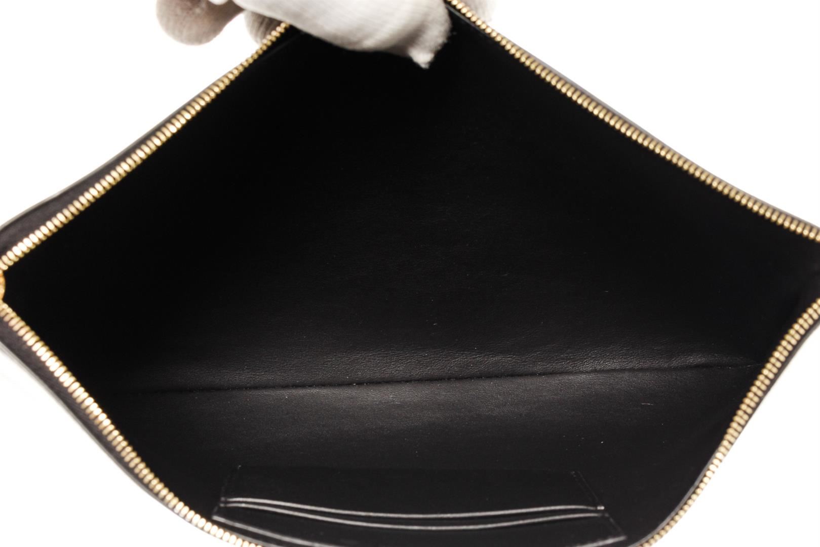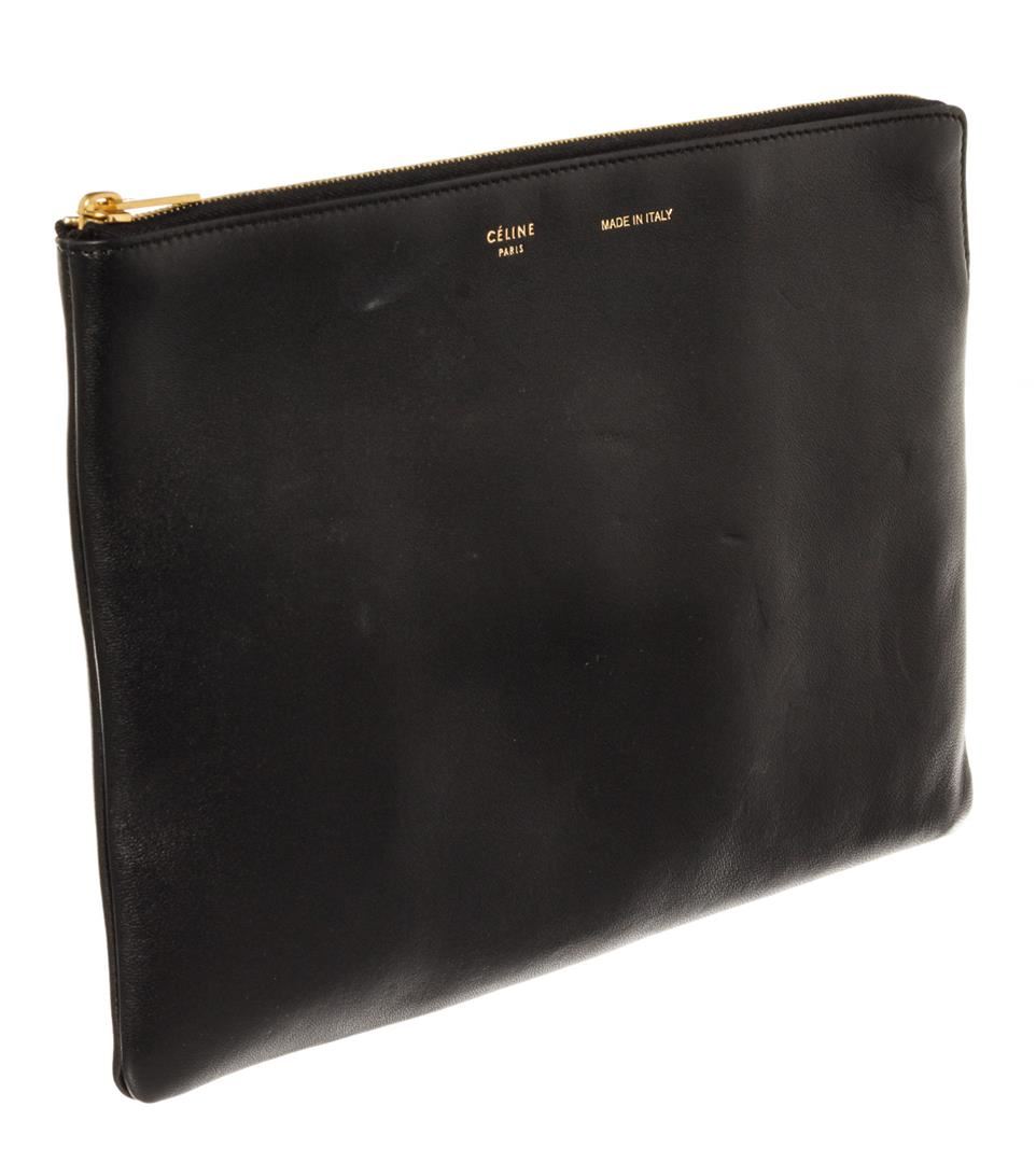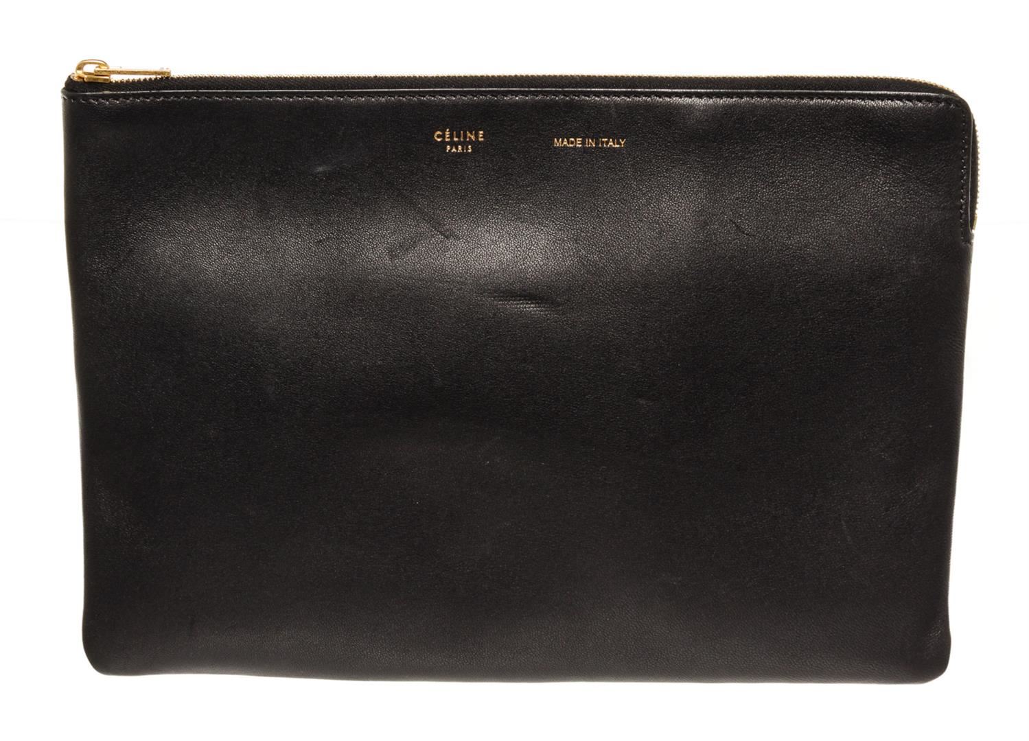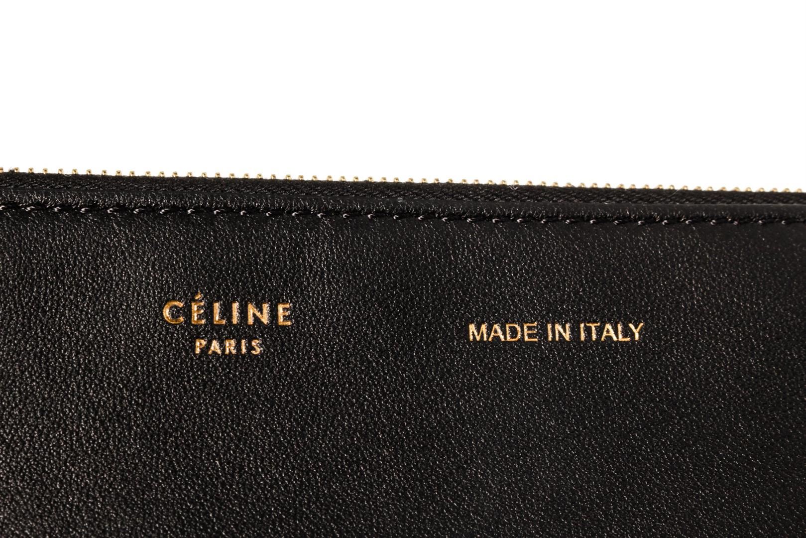 Black grained leather Celine Zip Around pouch with lettering printed in contrasting gold color on the front, main compartment with black leather lining, card slots inside and zipper closure at top. H: 7.8" x L: 9.8" x P: 0.8"