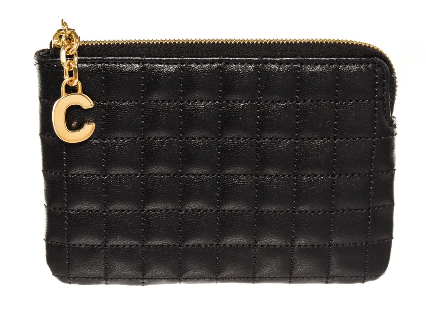 One Celine Black Quilted Calfskin Leather C Charm Coin and Card Pouch. Item is sold AS-IS. All available information is listed in the description and shown in the photo. Black quilted Calfskin leather Celine Black C Charm coin and card pouch with gold-tone metal hardware, zipped closure at top with C charm attached to the puller, two card slots and black Calfskin leather lining. 5 x 4 x 0.5 inches 5 x 4 x 0.5 inches