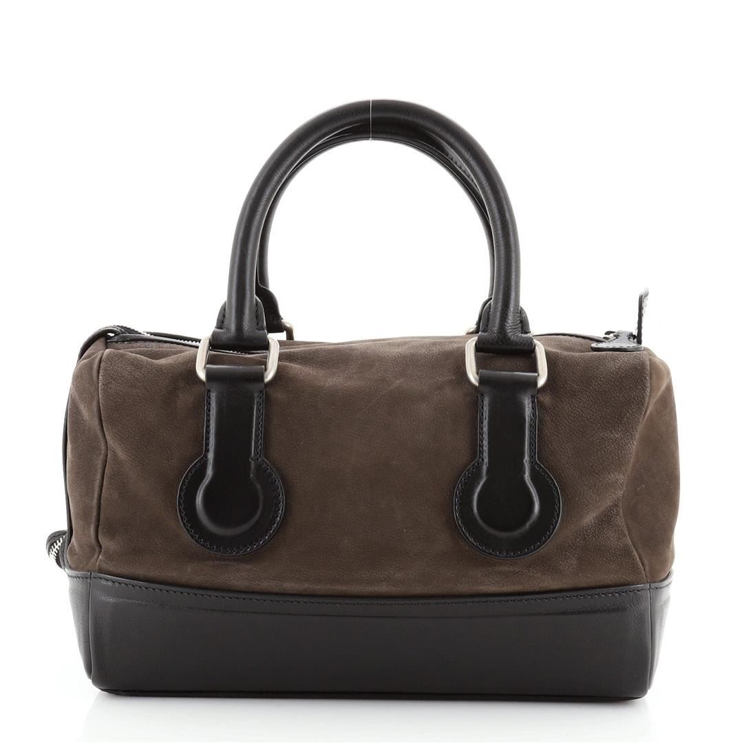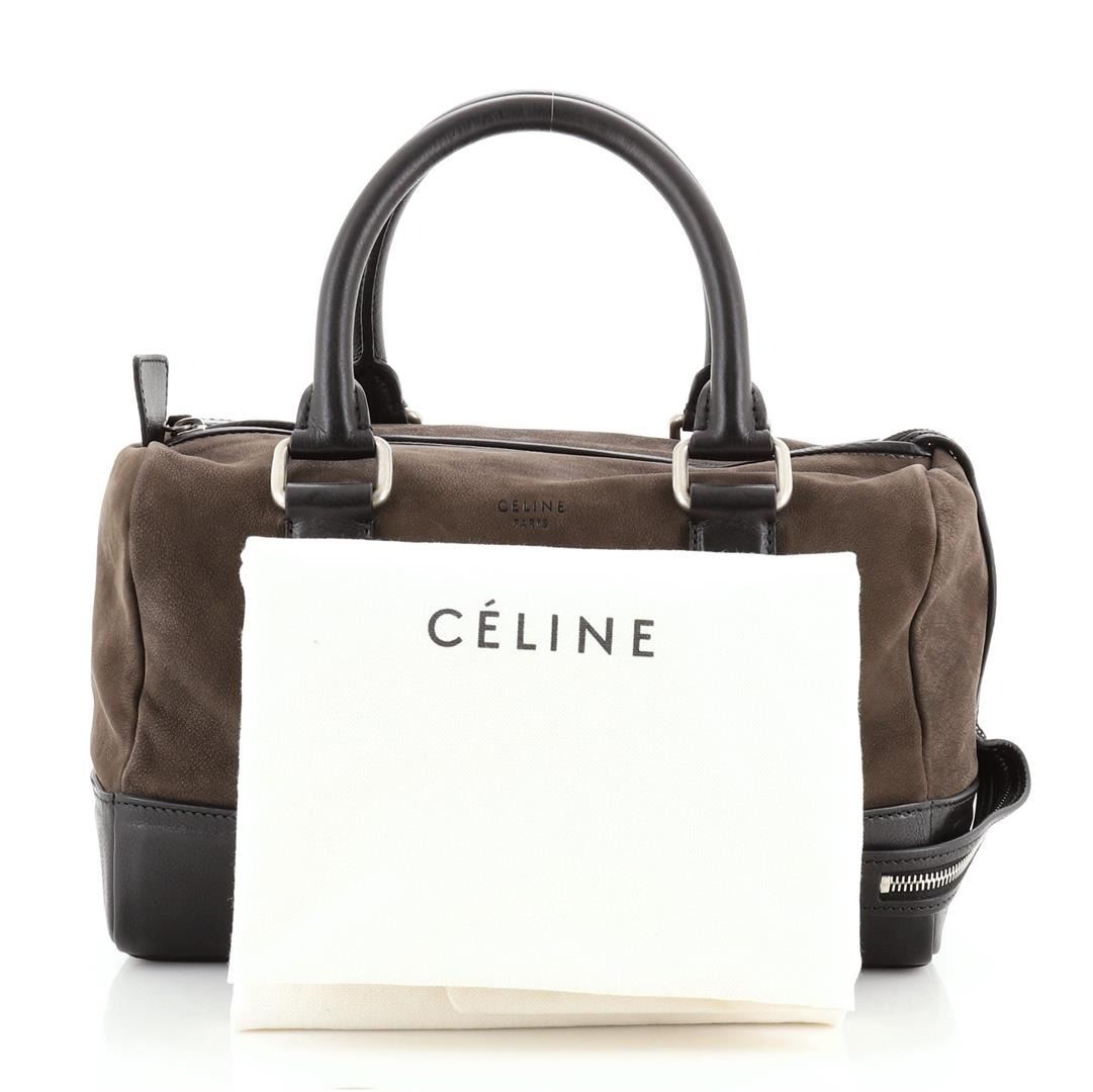 One Celine Boston Bag Suede and Leather Small Black, Neutral. Item is sold AS-IS. All available information is listed in the description and shown in the photo. Celine Boston Bag Suede and Leather Small Black, Neutral Condition Details: Creasing and scuffs on exterior, wear on exterior edges and in interior, scratches on hardware. Height ", Width ", Depth ", Strap Drop None