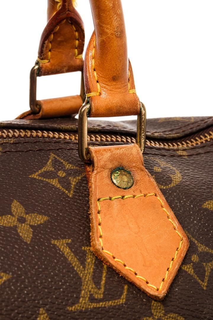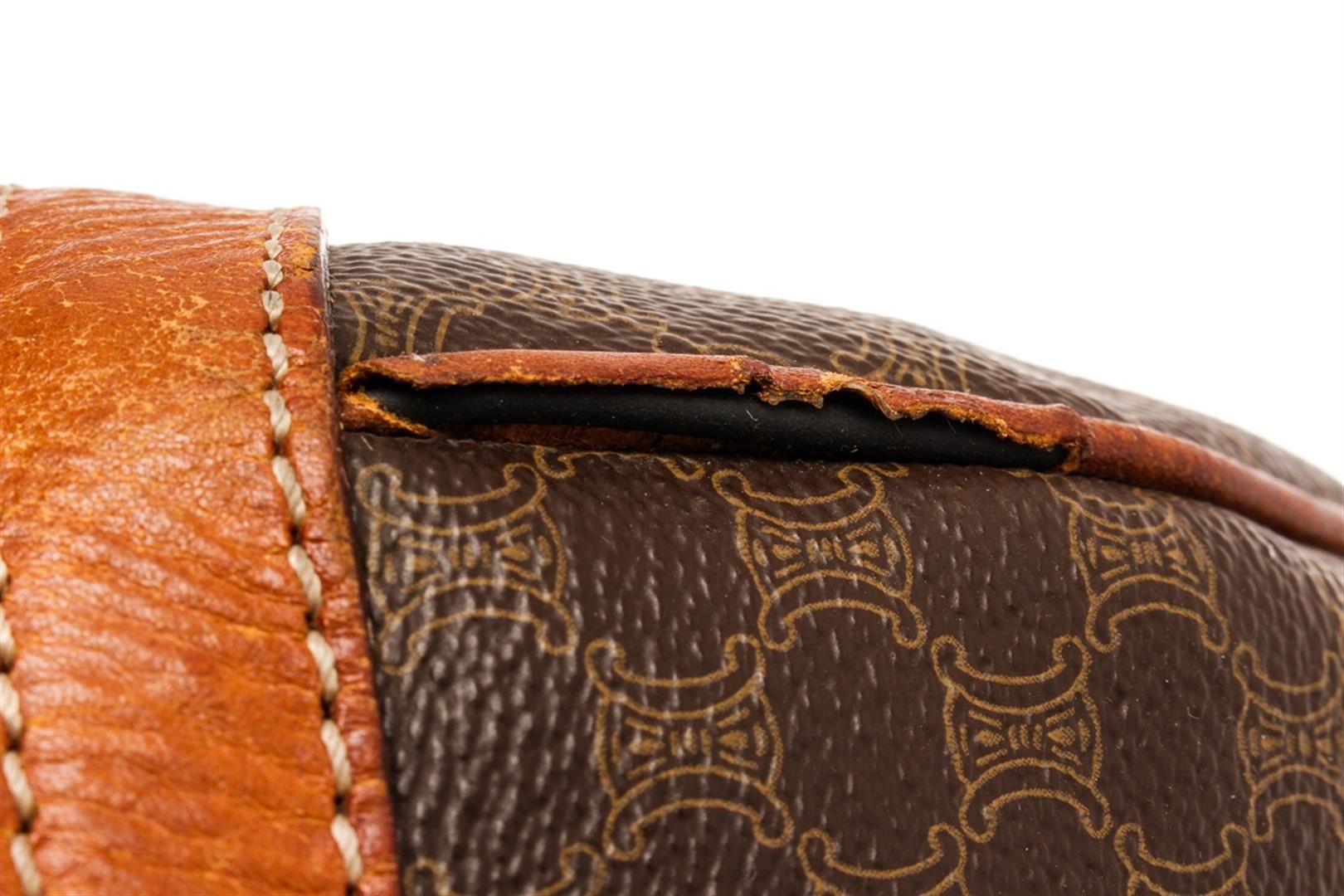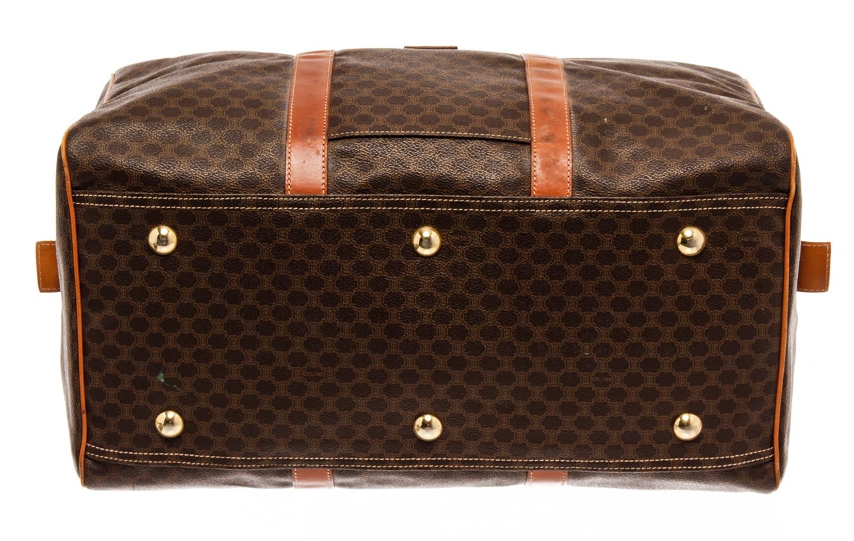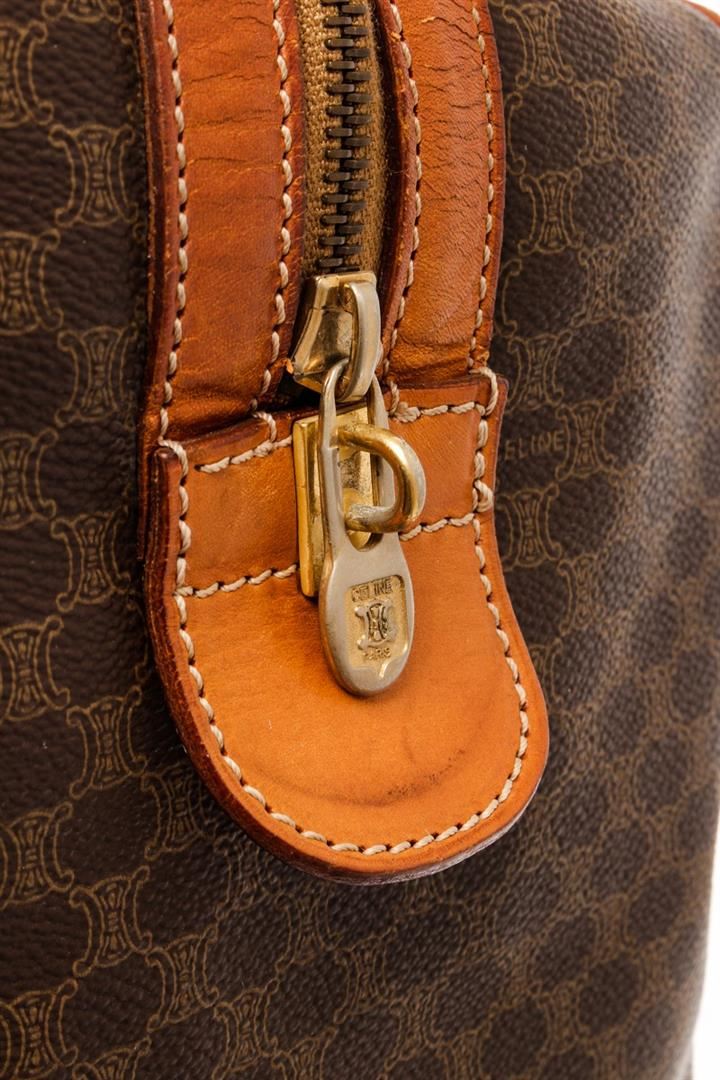Celine Brown Leather Macadam Duffle Bag. All available information is listed in the description and shown in the photos. Celine Brown Leather Macadam Duffle Bag with this duffle bag features vintage, brown printed, brass hardware, leather trim, dual rolled handles, leather trim embellishment, canvas lining, zip closure at top. Height: 9.75" Width: 17.75" Depth: 8.5", Handle Drop: 5.75" / 24.76 x 45.08 x 21.59 Cm