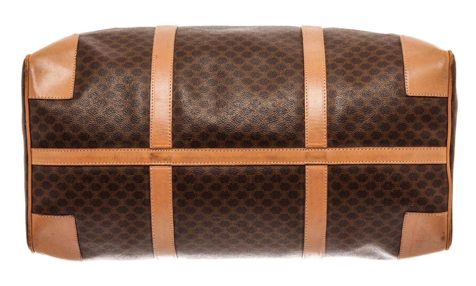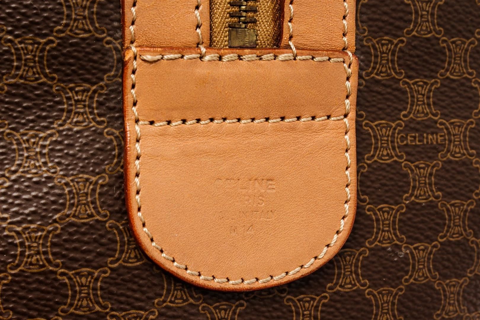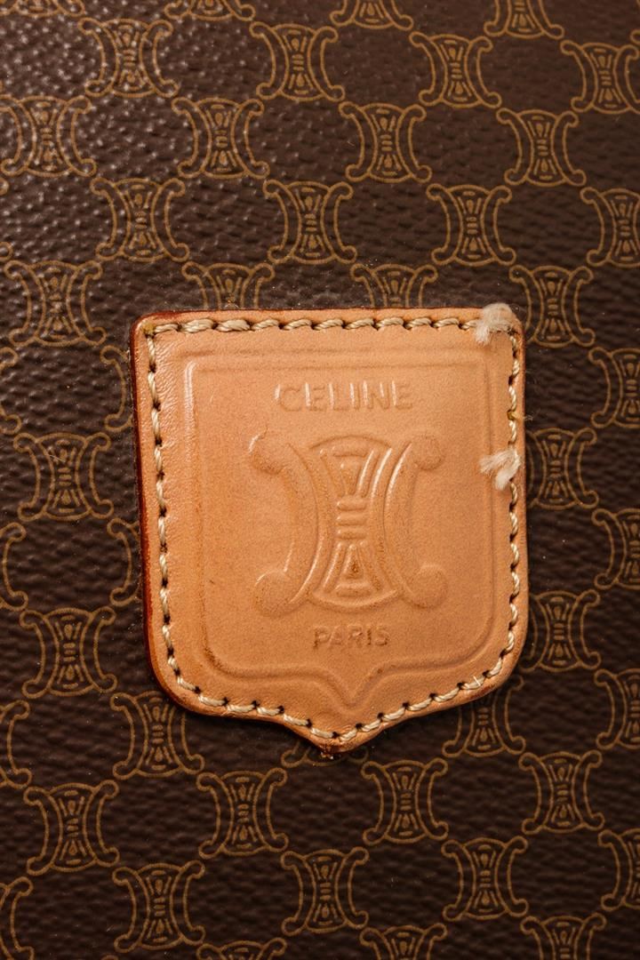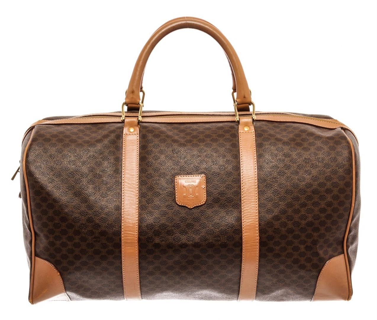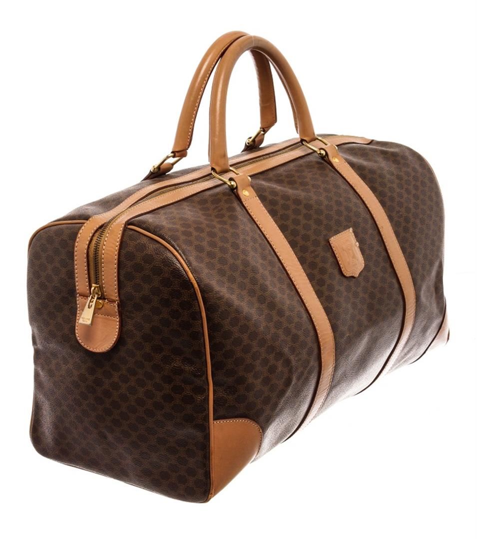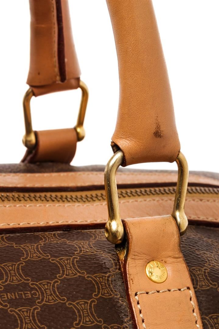 Celine Brown Leather Macadam Duffle Bag. All available information is listed in the description and shown in the photos. Celine Brown Leather Macadam Duffle Bag with this bag features, tan leather trim, dual rolled top handles, tonal stitching, gold-tone hardware, canvas interior lining, single pocket at interior wall and zip closure at top. Height 7", Width 16.25", Depth 13", Handle Drop 5" / 17.78 x 41.27 x 33.02 Cm