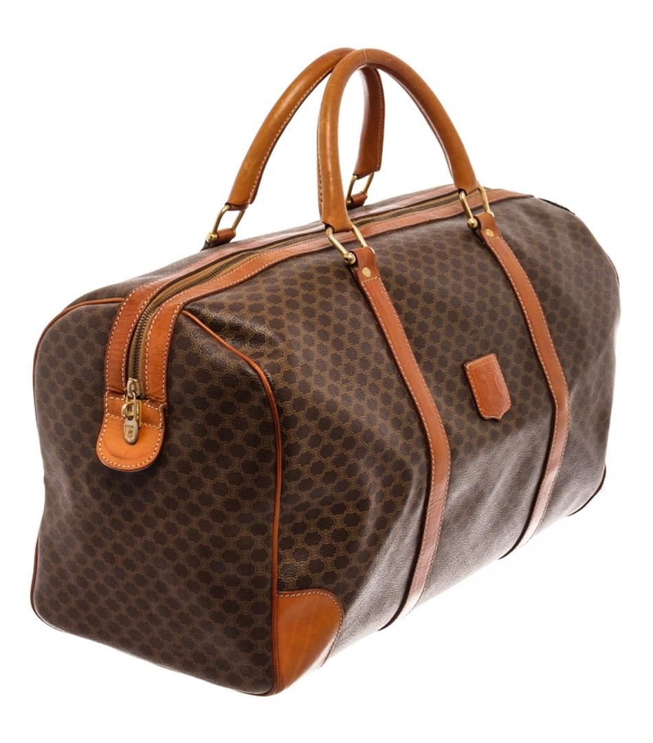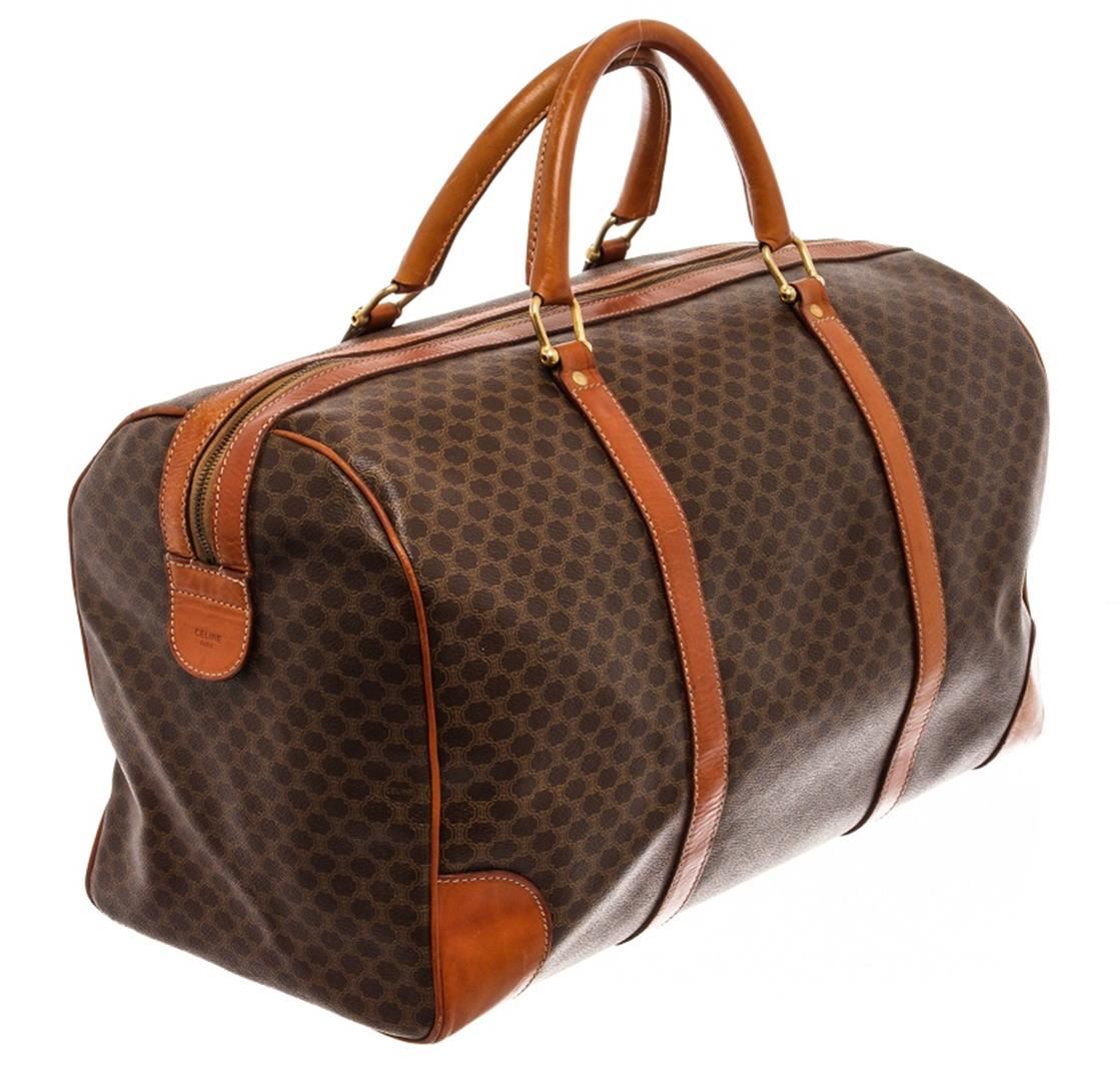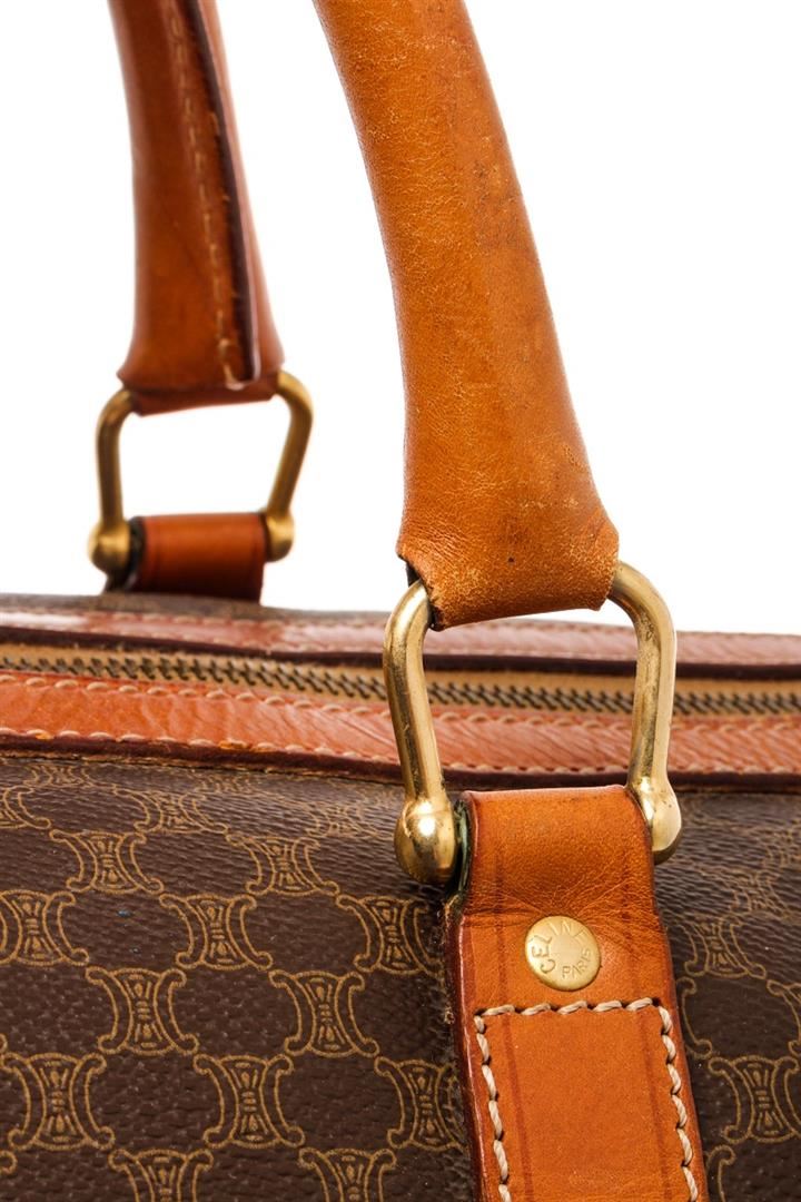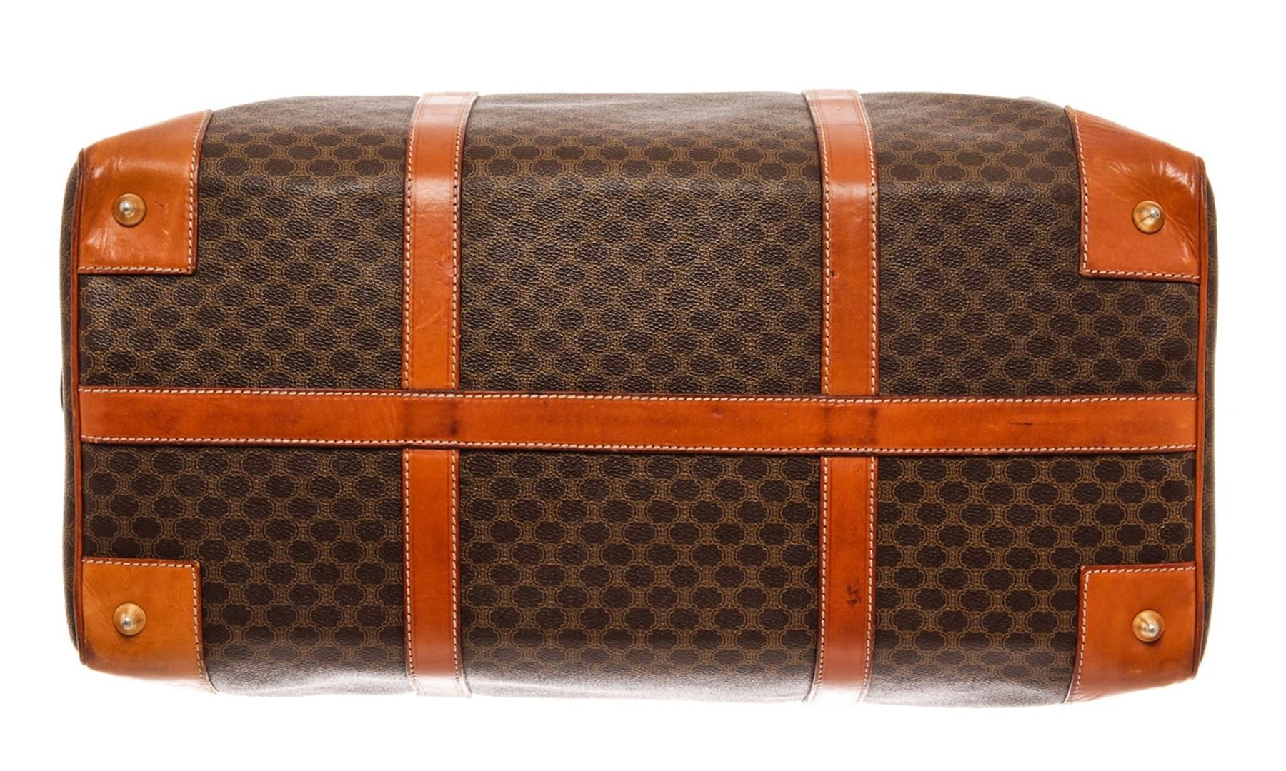 Celine Brown Leather Macadam Duffle Bag. All available information is listed in the description and shown in the photos. Celine Brown Leather Macadam Duffle Bag with this duffle bag features vintage, brown printed, brass hardware, leather trim, dual rolled handles, leather trim embellishment, canvas lining, zip closure at top. Height: 9.75" Width: 17.75" Depth: 8.5", Handle Drop: 5.75" / 24.76 x 45.08 x 21.59 Cm