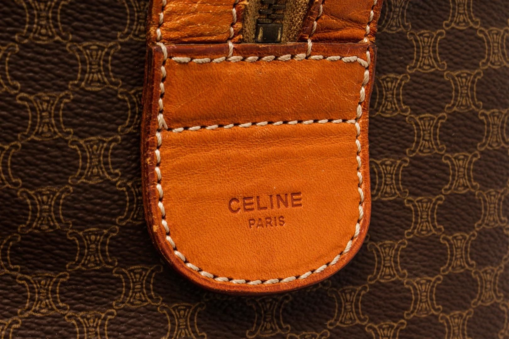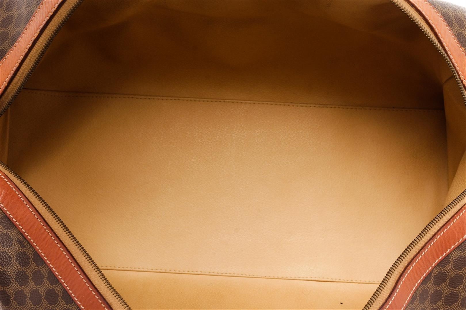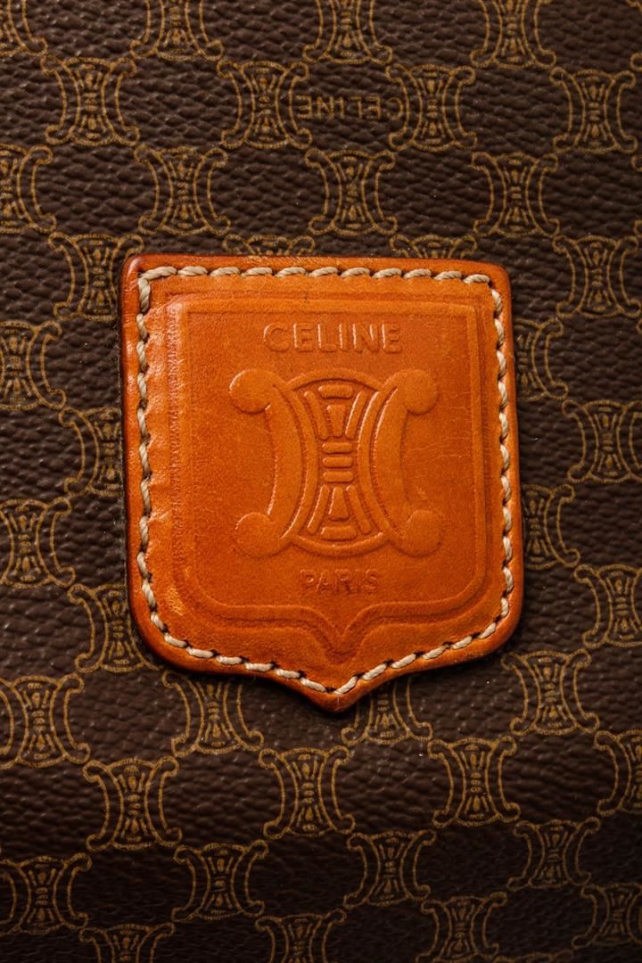 Celine Brown Leather Macadam Duffle Bag. All available information is listed in the description and shown in the photos. Celine Brown Leather Macadam Duffle Bag with this duffle bag features vintage, brown printed, brass hardware, leather trim, dual rolled handles, leather trim embellishment, canvas lining, zip closure at top. Height: 9.75" Width: 17.75" Depth: 8.5", Handle Drop: 5.75" / 24.76 x 45.08 x 21.59 Cm