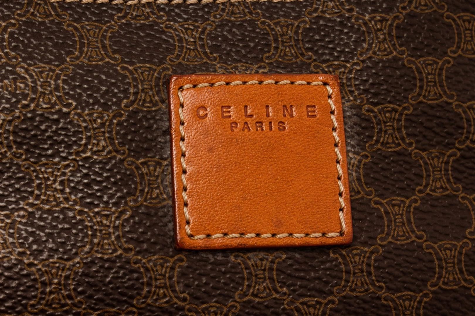 Celine Brown Leather Macadam Duffle Bag. All available information is listed in the description and shown in the photos. Celine Brown Leather Macadam Duffle Bag with this duffle bag features vintage, brown printed, brass hardware, leather trim, dual rolled handles, leather trim embellishment, canvas lining, zip closure at top. Height: 9.75" Width: 17.75" Depth: 8.5", Handle Drop: 5.75" / 24.76 x 45.08 x 21.59 Cm
