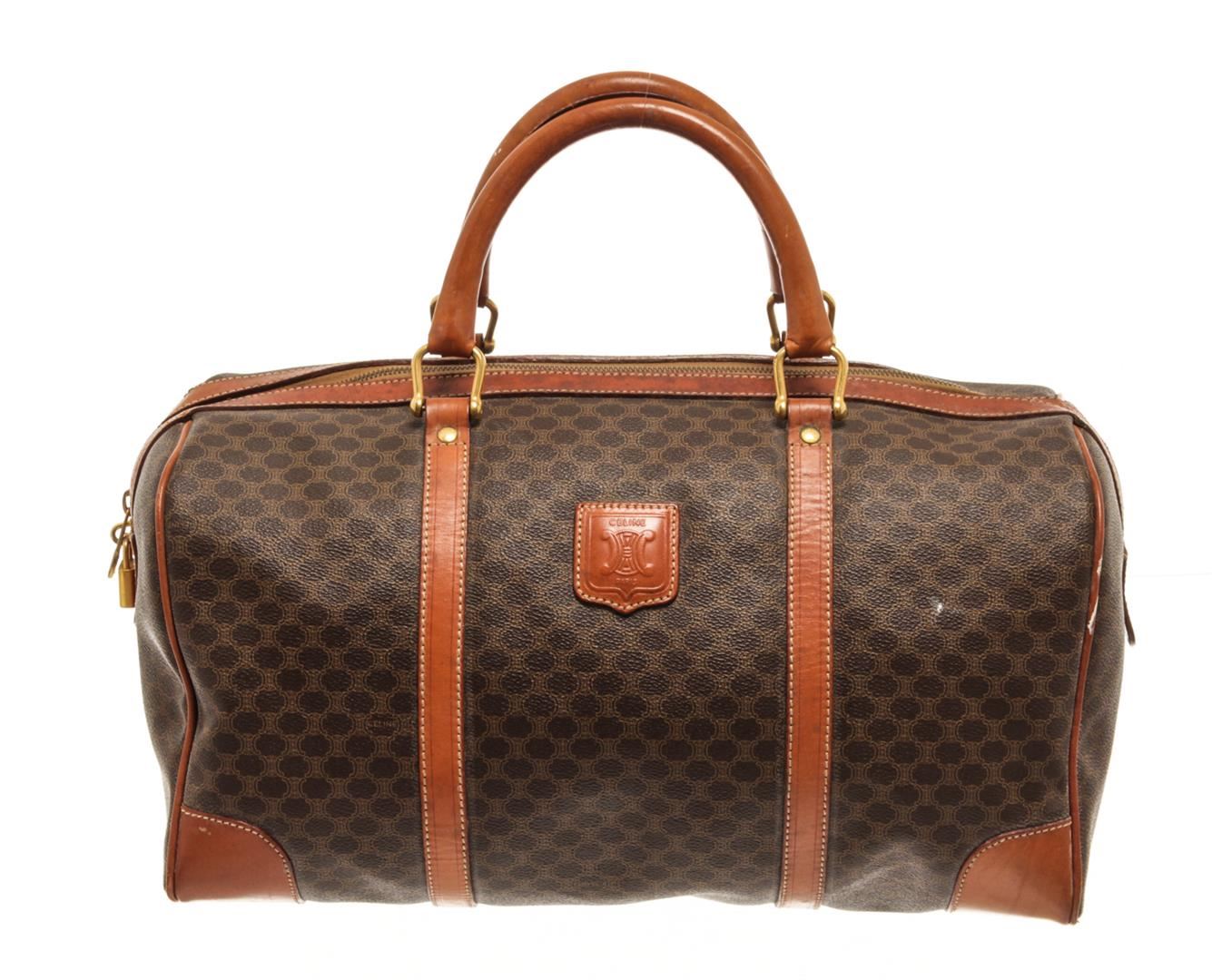 One Celine Brown Macadam Boston Bag. Item is sold AS-IS. All available information is listed in the description and shown in the photo. Celine Brown Macadam Boston Bag with top handle, gold tone hardware, zipper closure and canvas lining. There is wear on the bottom and white marks around the bag. Please refer to photos.