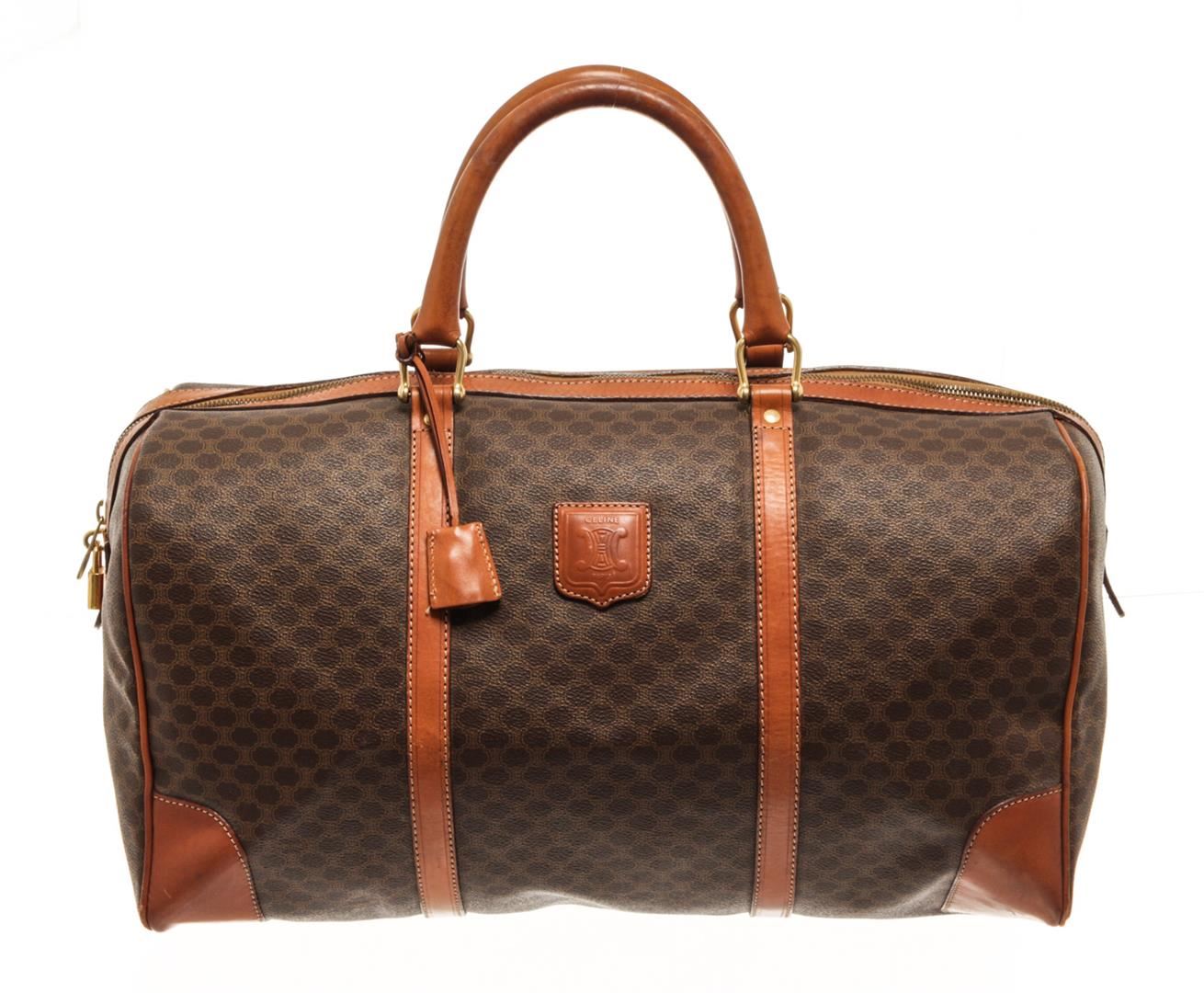 One Celine Brown Macadam Pattern Logo Embossed Big Boston Bag. Item is sold AS-IS. All available information is listed in the description and shown in the photo. Celine Brown Macadam Pattern Logo Embossed Big Boston Bag with top handle, keys, clochette and lock, zipper closure, canvas lining. There is some wear on the bottom of the bag. Please refer to photos. H 28cm x W 48cm x D 20cm Handle 35cm. / 11.02 x 18.89 x 7.87 Inches