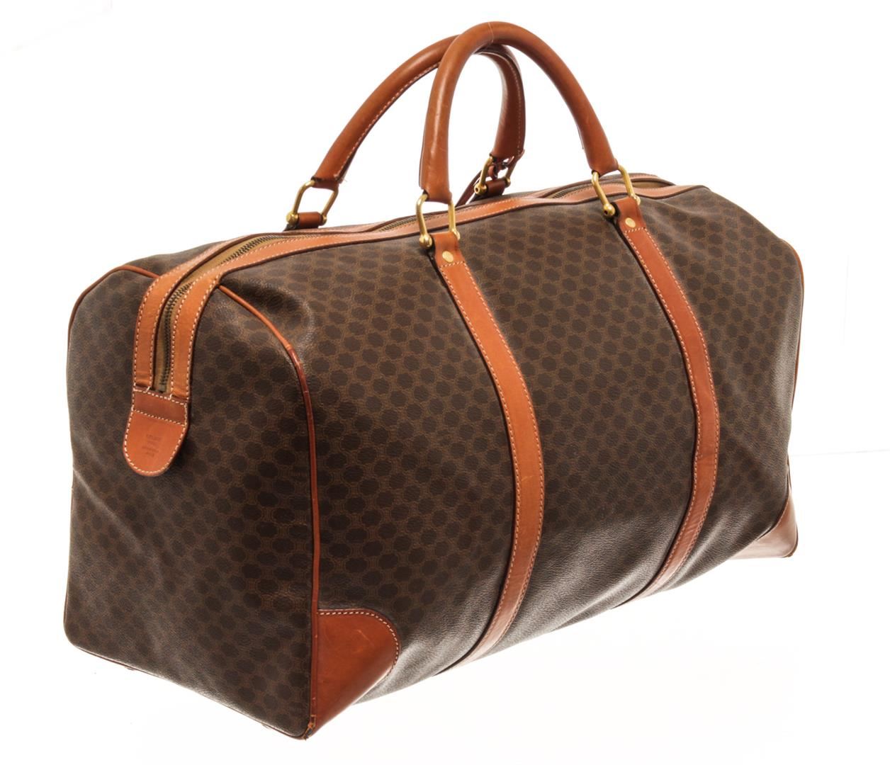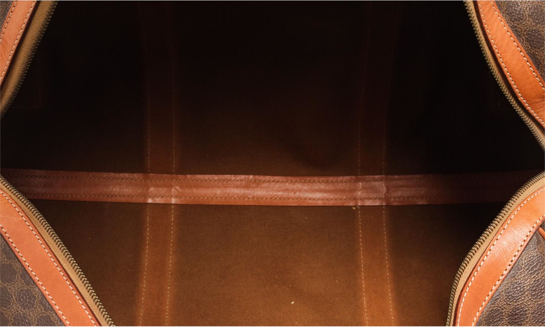 One Celine Brown Macadam Pattern Logo Embossed Big Boston Bag. Item is sold AS-IS. All available information is listed in the description and shown in the photo. Celine Brown Macadam Pattern Logo Embossed Big Boston Bag with top handle, keys, clochette and lock, zipper closure, canvas lining. H 28cm x W 48cm x D 20cm Handle 35cm. / 11.02 x 18.89 x 7.87 Inches