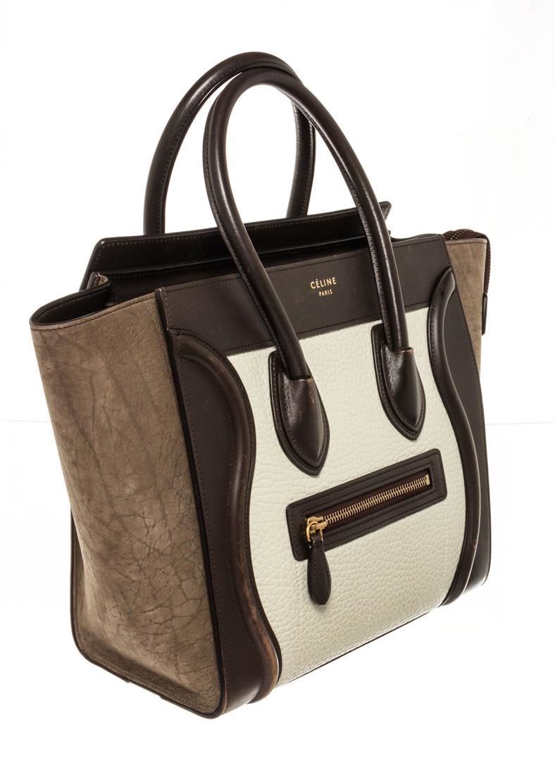 Celine Brown Multicolor Suede Leather Micro Luggage Handbag. All available information is listed in the description and shown in the photos. Celine Multicolor Mini Luggage with brown and ivory leather, brown suede, gold-tone hardware, dual rolled top handles, single zip pocket and foil-stamped logo at front face, protective feet at base, brown leather lining, three pockets at interior walls; one with zip closure and zip closure at top. Height 10", Width 10", Depth 5", Handle Drop 23"