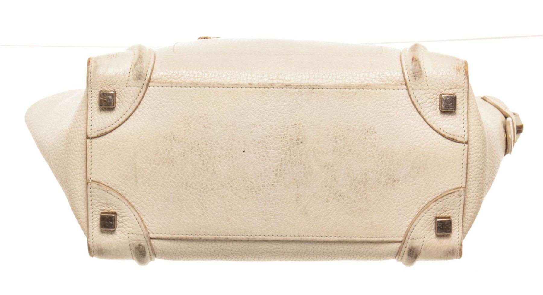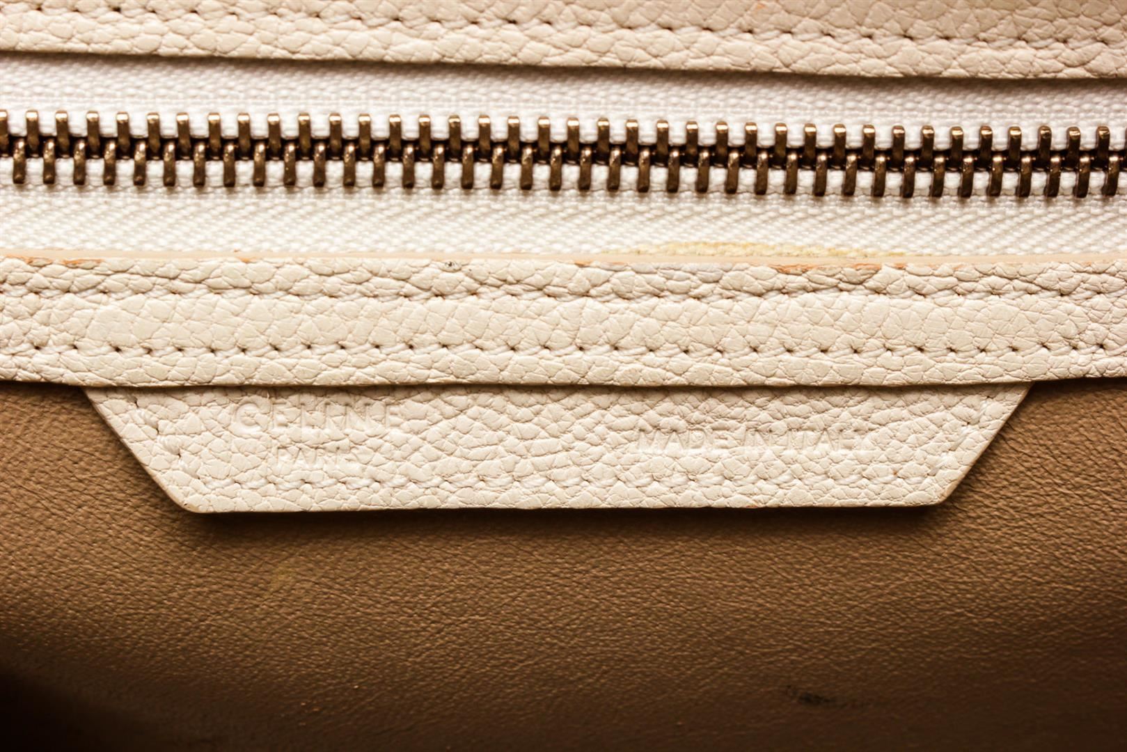 One Celine Cream Leather Mini Luggage Tote Bag. Item is sold AS-IS. All available information is listed in the description and shown in the photo. Celine Cream Leather Mini Luggage Tote Bag, gold-tone hardware, exterior zip pocket, interior slip pocket, dual top handle and zipper closure.