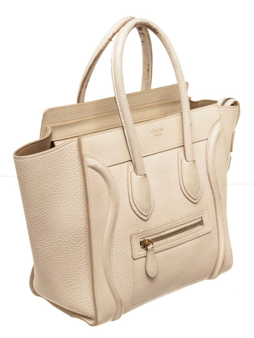 One Celine Cream Leather Mini Luggage Tote Bag. Item is sold AS-IS. All available information is listed in the description and shown in the photo. Celine Cream Leather Mini Luggage Tote Bag, gold-tone hardware, exterior zip pocket, interior slip pocket, dual top handle and zipper closure.