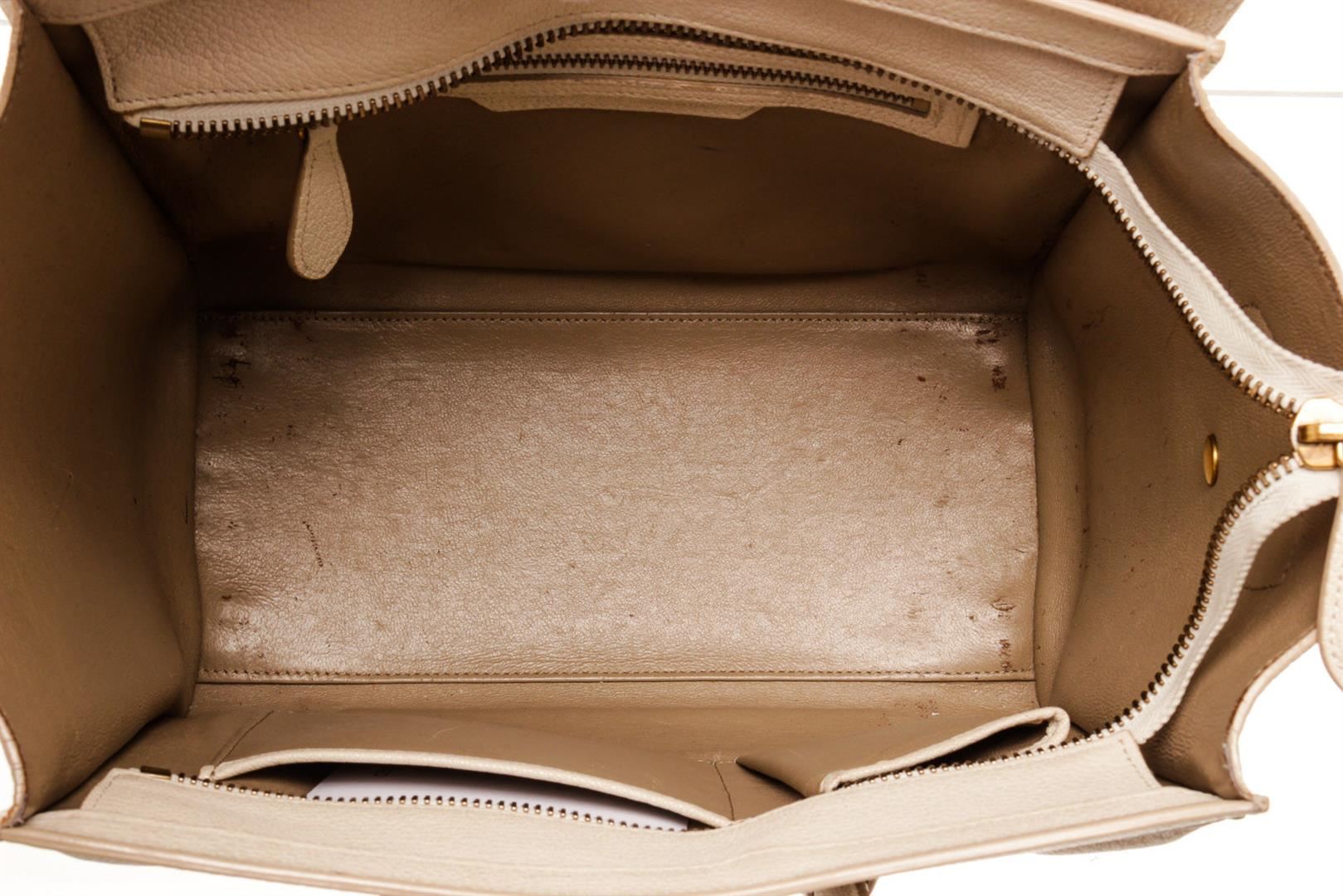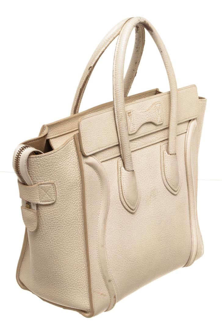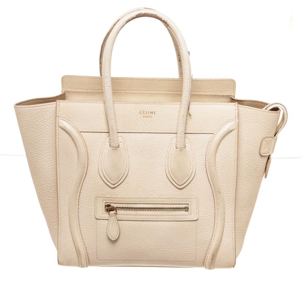 One Celine Cream Leather Mini Luggage Tote Bag. Item is sold AS-IS. All available information is listed in the description and shown in the photo. Celine Cream Leather Mini Luggage Tote Bag, gold-tone hardware, exterior zip pocket, interior slip pocket, dual top handle and zipper closure.