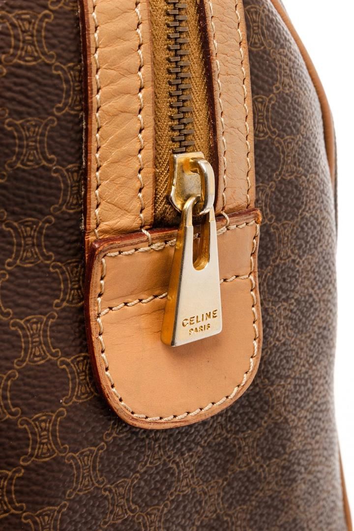 Celine Dark Brown Leather Macadam Boston Bag. All available information is listed in the description and shown in the photos. Celine Dark Brown Leather Macadam Boston Bag with gold-tone hardware, leather trim, dual rolled handles, leather trim embellishment, leather lining & single interior pocket, zip closure at top, protective feet at base. Height: 7.5" Width: 12" Depth: 6", Handle Drop: 3.5" / 19.05 x 30.48 x 15.24 Cm
