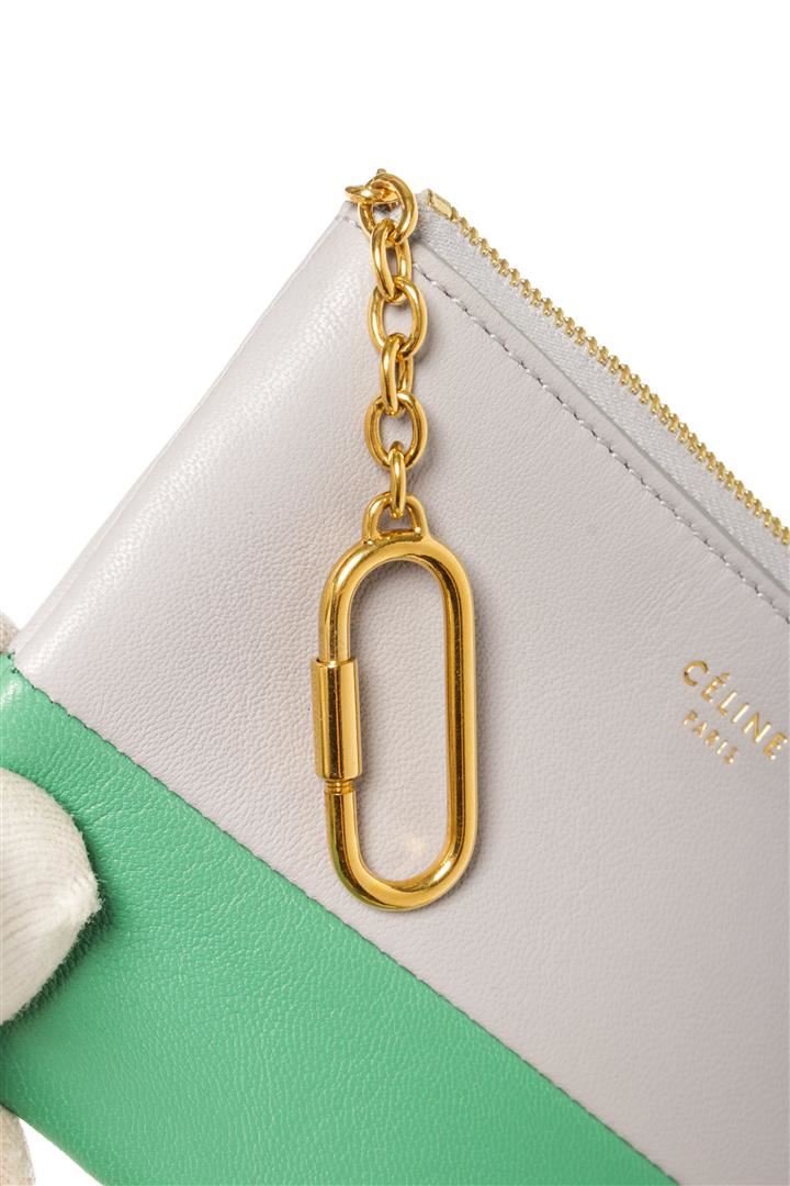One Celine Gray & Green Bicolor Solo Clutch Leather Coin Pouch. Item is sold AS-IS. All available information is listed in the description and shown in the photo. Celine Gray & Green Bicolor Solo Clutch Leather Coin Pouch with gold-tone hardware, gray leather trim, gray leather lining, with interior pockets, exterior ring, and zipper closure