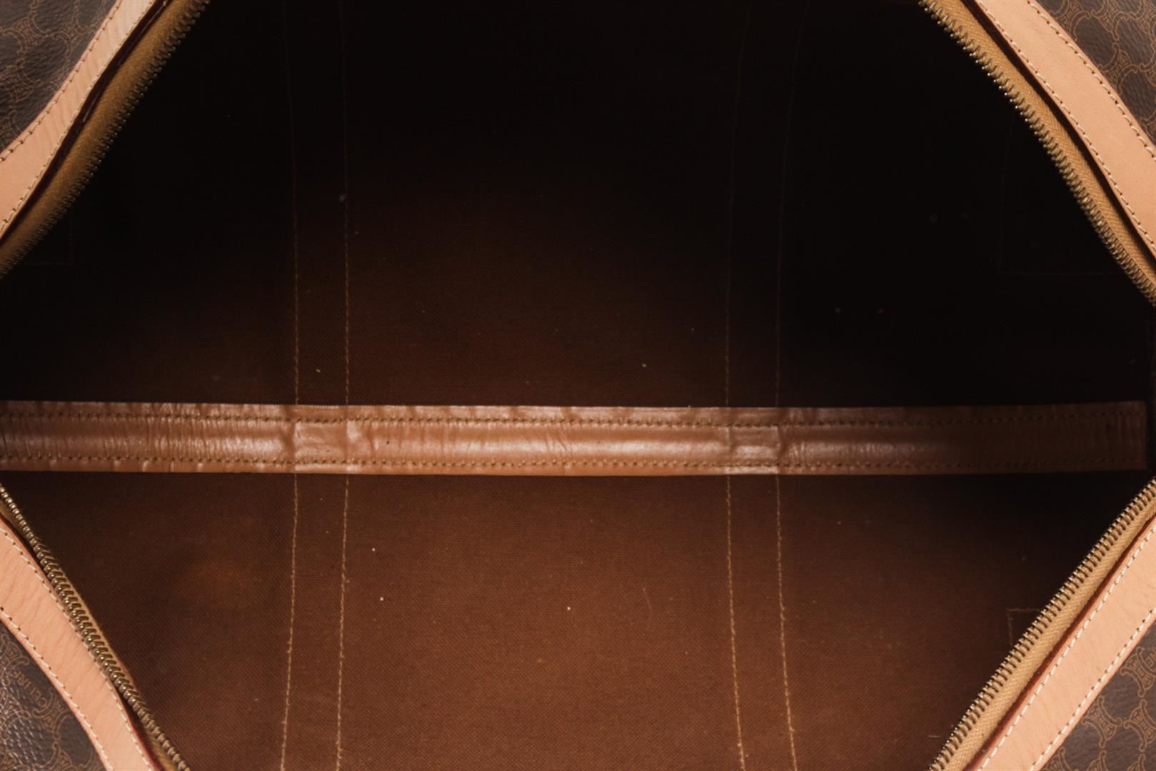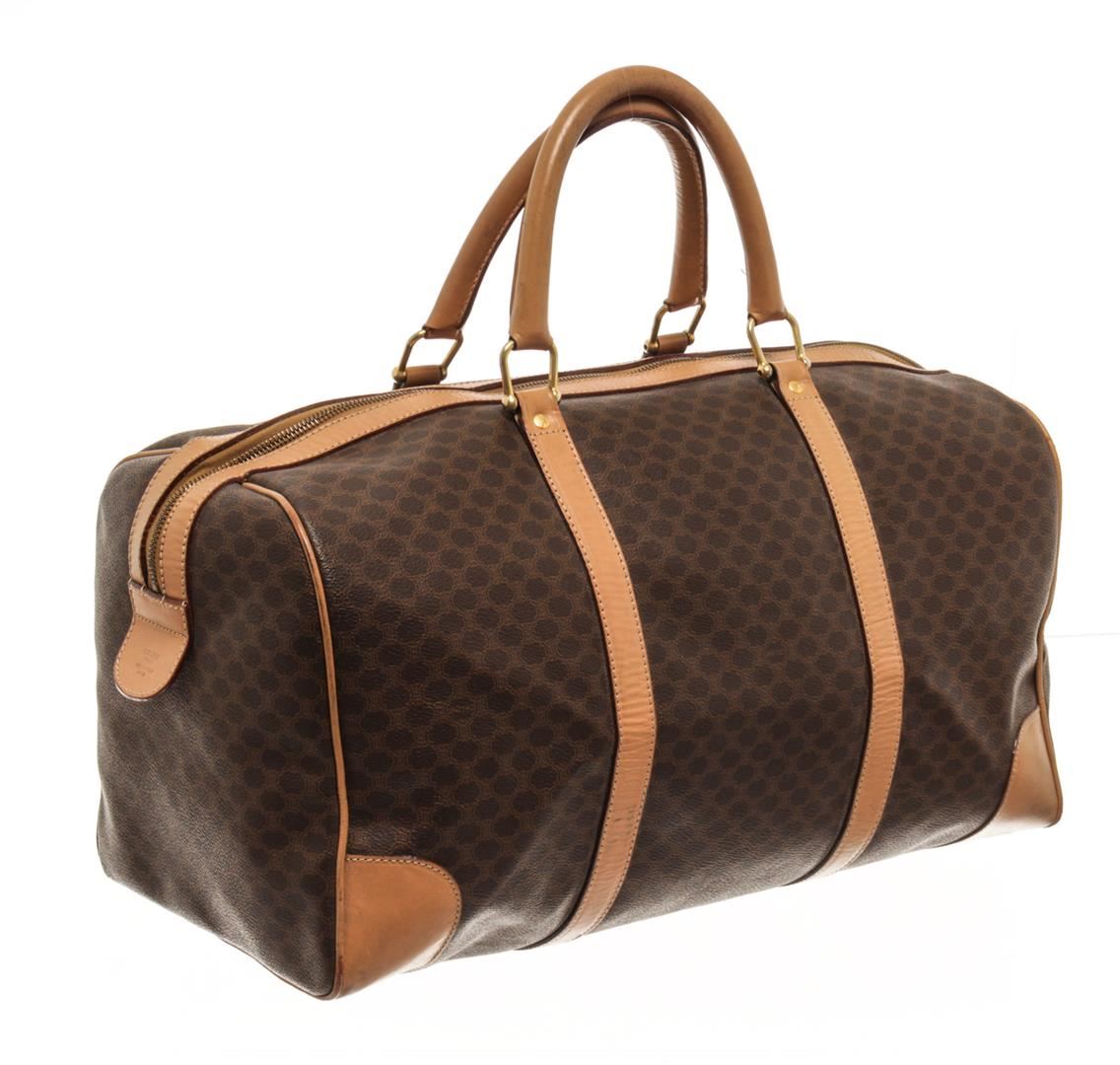 One Celine Macadam Pattern Logo Embossed Big Boston Bag Brown. Item is sold AS-IS. All available information is listed in the description and shown in the photo. Celine Macadam Pattern Logo Embossed Big Boston Bag Brown with top handle, gold tone hardware and zipper closure. Bottom of bag is very worn and stained, white mark towards the bottom of the bag. Please refer to photos.