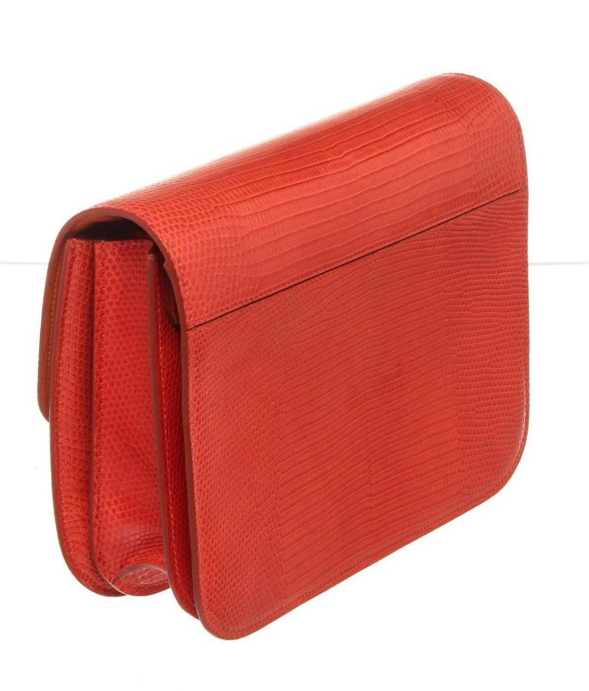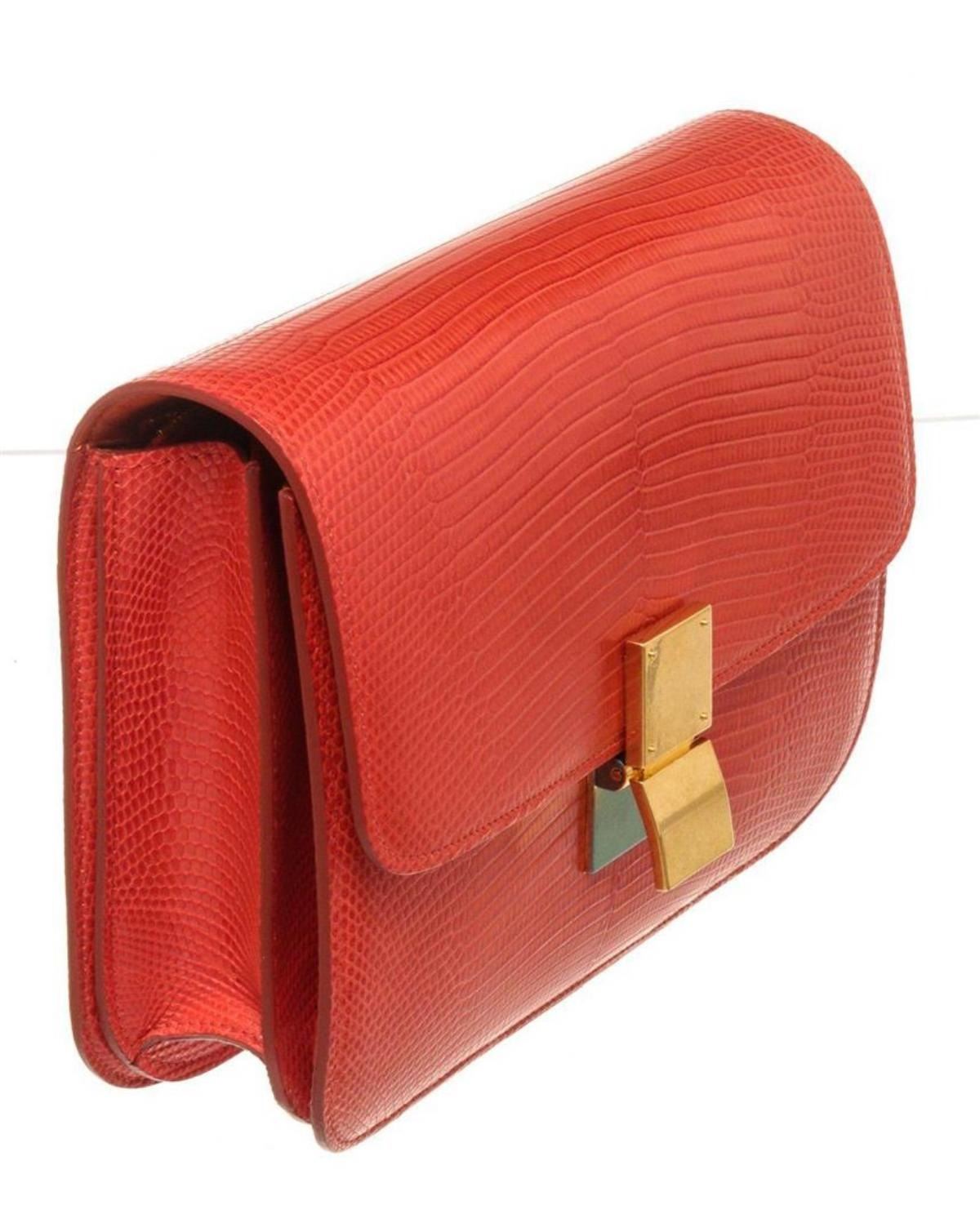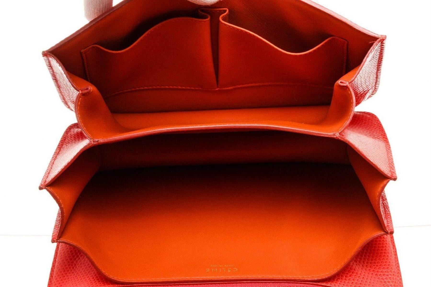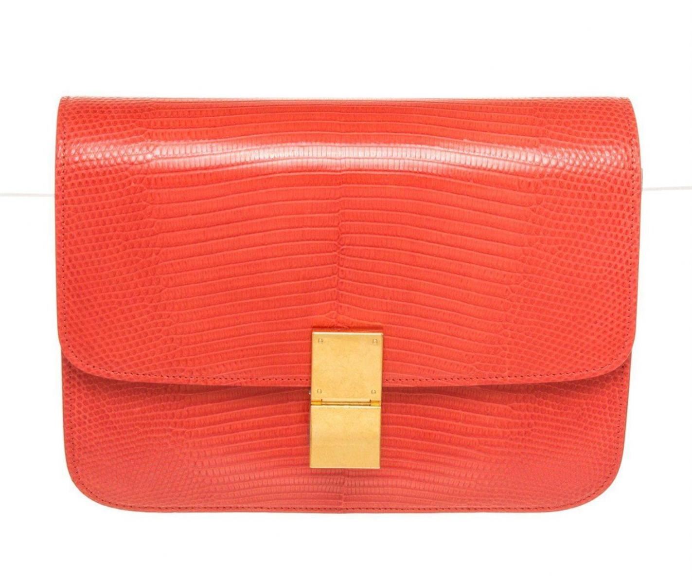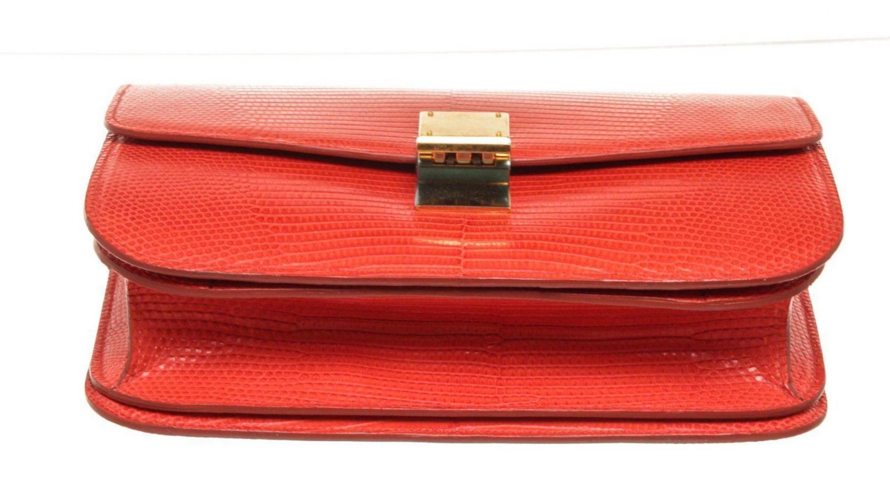 Celine Orange Lizard Skin Leather Medium Box Shoulder Bag with silver-tone hardware, single flat top handle, brown leather trim, flip-lock closure at front