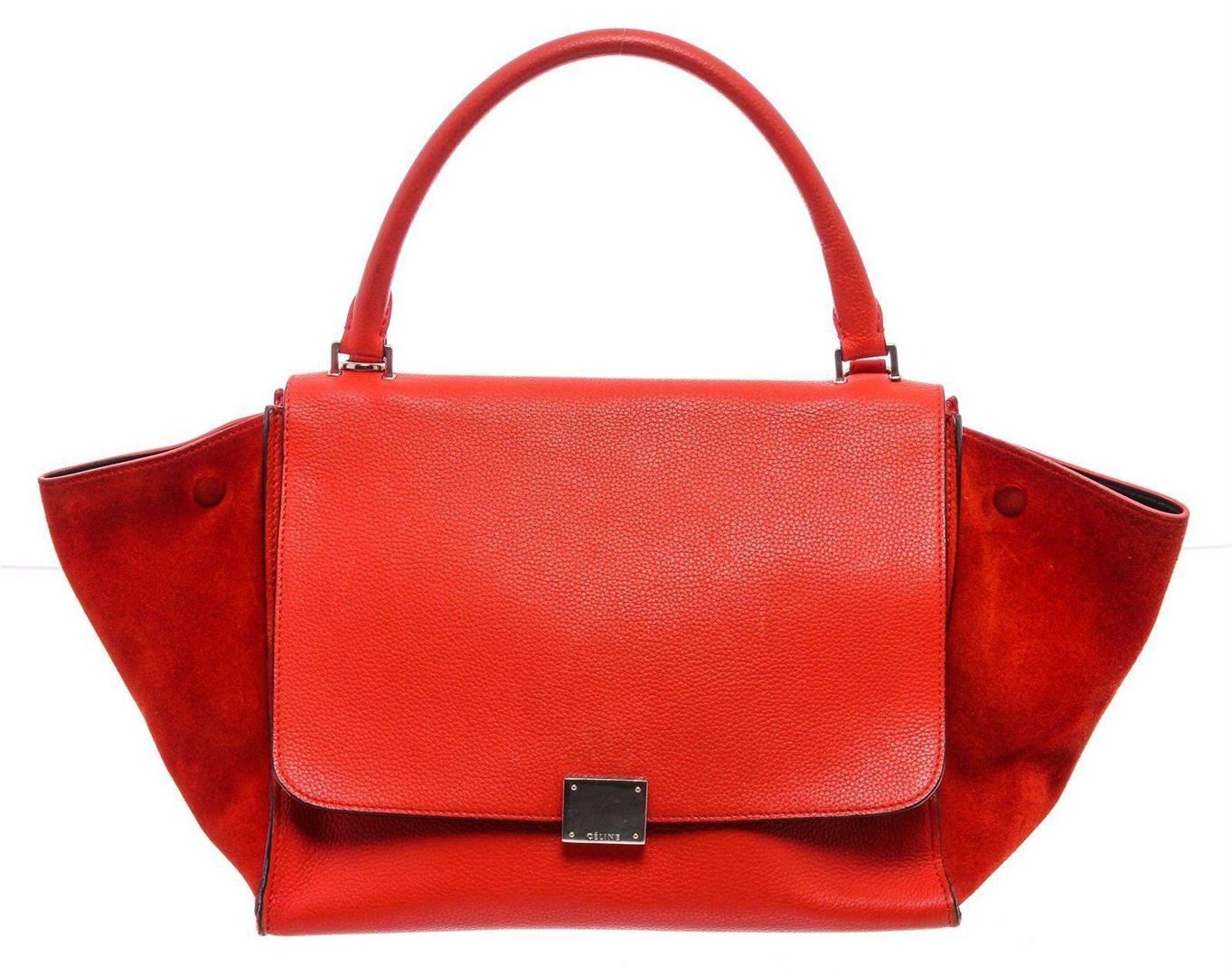 Red leather Céline Medium Trapeze bag with gold-tone hardware, single detachable flat shoulder strap, single rolled top handle, single exterior zip pocket, snap expansions at sides, suede panels at sides, black leather lining, dual interior slit pockets and zip closure at top with additional flip-lock closure at front flap. Measurements: Length: 12 in / 30 cm Width: 4 in / 10 cm 9.5 in / 24 cmCONDITION: Pre-Owned Good overall, please see photographs for detail.