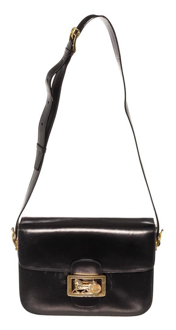 Celine Vintage Black Leather Horse Carriage Box Shoulder Bag. Please see photos and description for all available information! Black smooth leather vintage Cline Box bag with gold-tone hardware, adjustable flat shoulder strap, brown leather lining, three