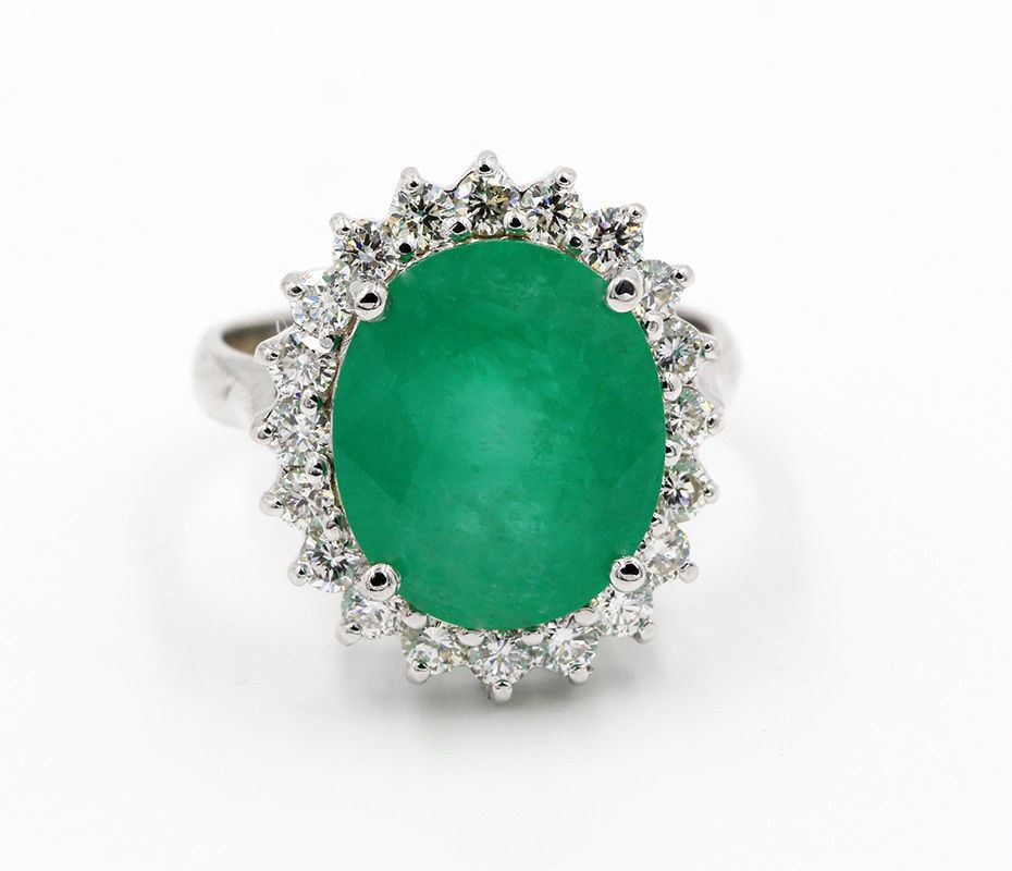 One Natural (Not-Enhanced) Oval Cut Emerald Diamond Wedding Engagement Ring in 14k White Gold. Size is 6.75 but able to resize, Total carat weight of ring is 6.91 Ct. The setting style is 4 prong with accent. The metal is white gold with 14k purity. Gross weight of the ring is 5.02 grams with a total of 21 stones. Condition is brand new. The main stone is non-enhanced / natural and is 6.00 carats. Stone shape is oval, fine bight clarity, and is natural emerald. Size approximation is 13.80 x 11.32 mm, main stone cut is excellent. Side stones are non-enhanced / natural and 0.91 carats. G-H color. Side diamond shape is brilliant round cut, with fine even color clarity. Side diamond color is natural emerald and cut is excellent. 20 total side diamonds. Included with independent certification with a retail value of $8,400.