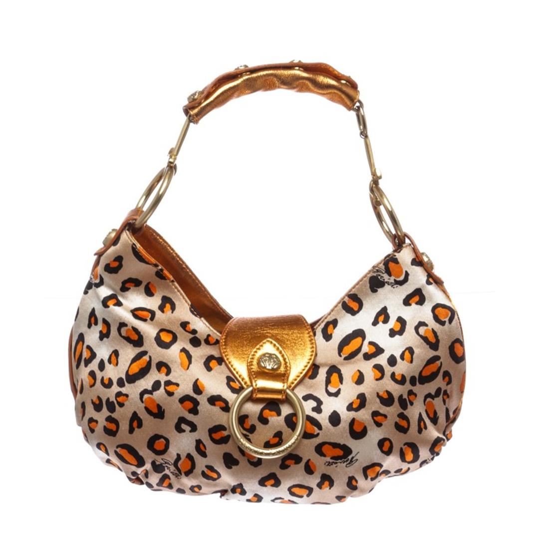 One Cesare Paciotti Orange Metallic Leather Leopard Print Small Shoulder Handbag. Cesare Paciotti orange metallic leather small shoulder handbag. Gold tone hardware, single strap, magnetic snap closure. Inner purple fabric lining, side snap closure pocket