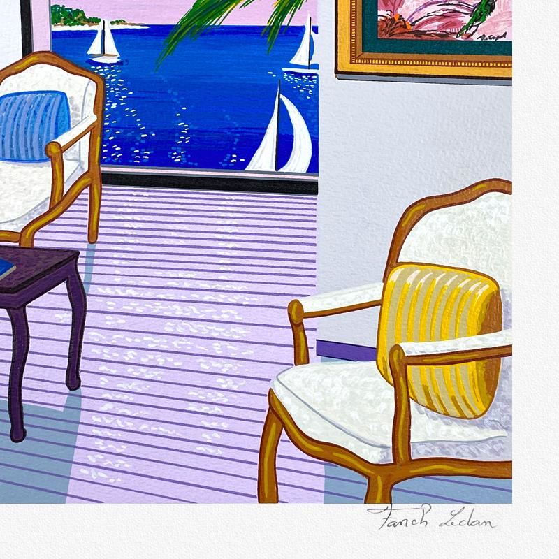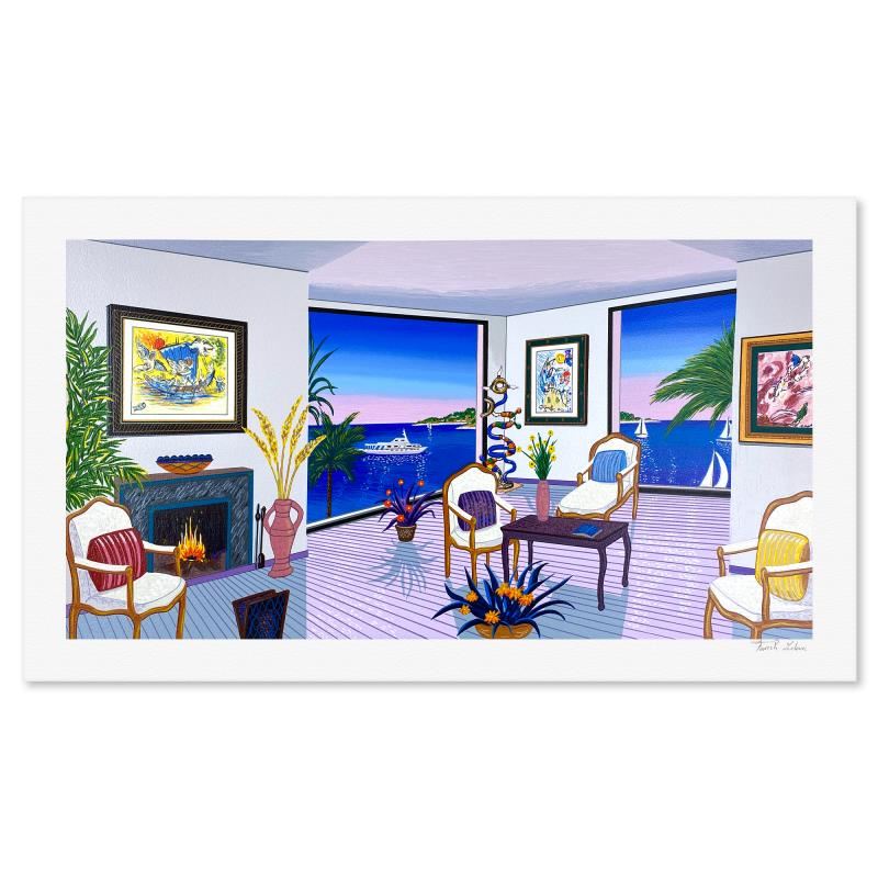 "Chagall in the South" is a limited edition serigraph on paper by Fanch numbered and hand signed by the artist. Includes Letter of Authenticity. Measures approx. 17.5" x 31.5" (border) 14" x 28" (image). There are minor imperfections in the white border area.