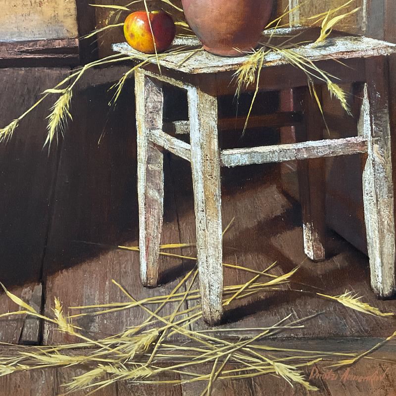 "Chair and Wheat" is an original oil painting on canvas by by Dmitri Annenkov, hand signed by the artist. This piece comes framed. Includes Letter of Authenticity. Measures approx. 45" x 27" (frame), 37" x 19.5" (image). There is some wear on the frame.