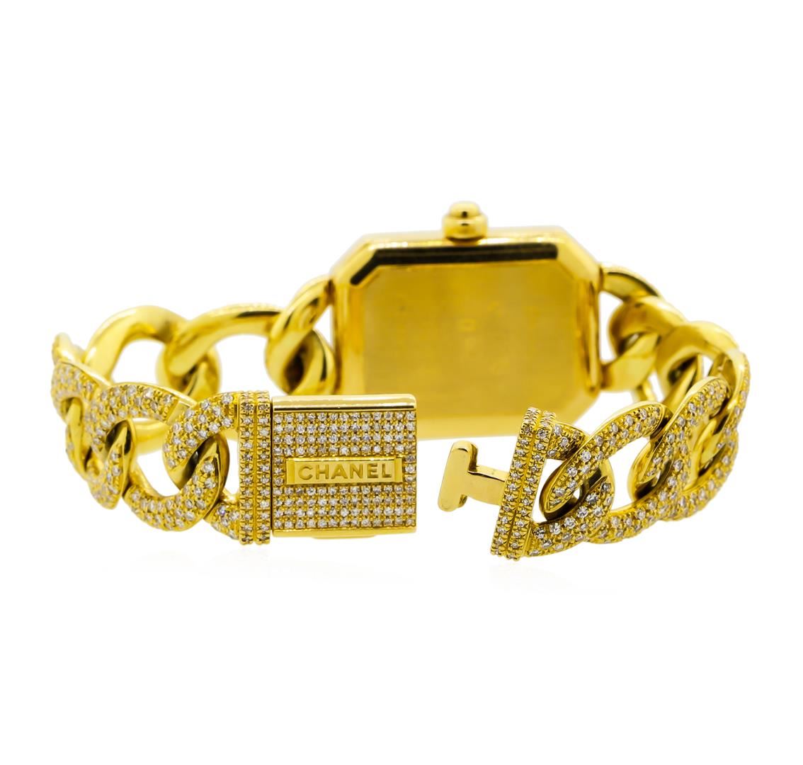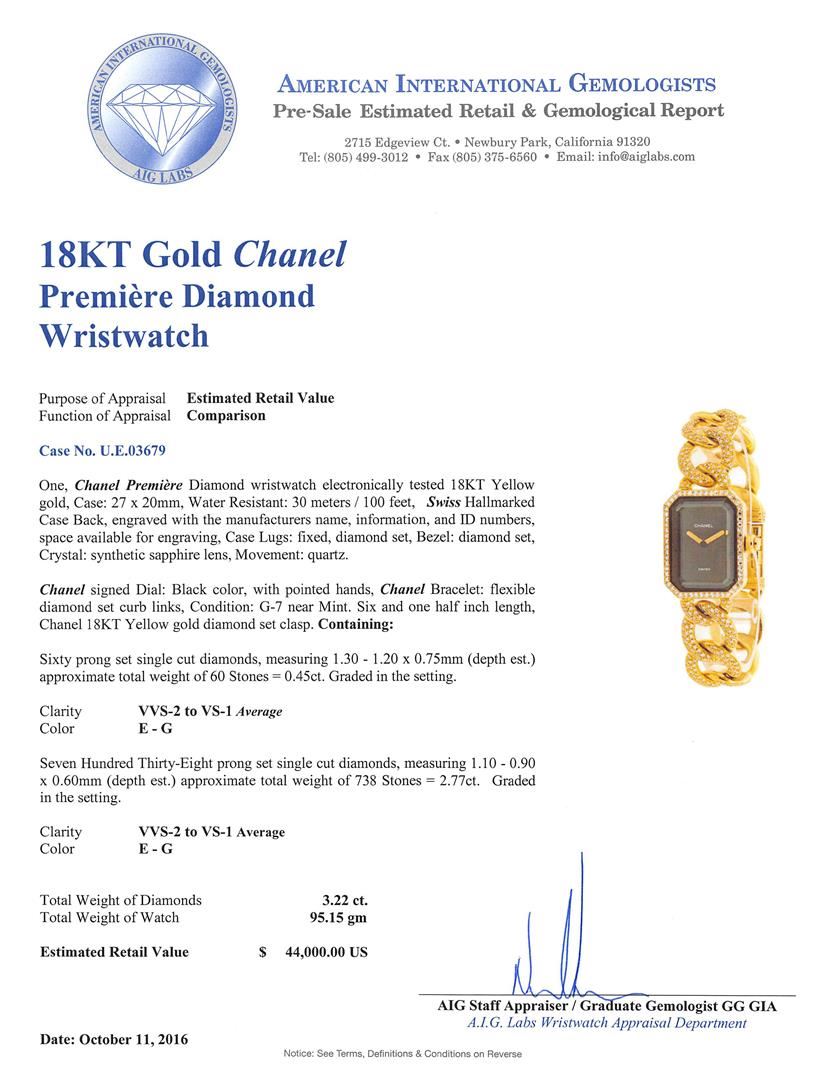 One, Chanel Premiere Diamond wristwatch electronically tested 18KT Yellow gold, Case: 27 x 20mm, Water Resistant: 30 meters / 100 feet, Swiss Hallmarked Case Back, engraved with the manufacturers name, information, and ID numbers, space available for engraving, Case Lugs: fixed, diamond set, Bezel: diamond set, Crystal: synthetic sapphire lens, Movement: quartz. Chanel signed Dial: Black color, with pointed hands, Chanel Bracelet: flexible diamond set curb links, Condition: G-7 near Mint. Six and one half inch length, Chanel 18KT Yellow gold diamond set clasp. Containing: Sixty prong set single cut diamonds, measuring 1.30 - 1.20 x 0.75mm (depth est.) approximate total weight of 60 Stones = 0.45ct. Graded in the setting. Clarity: VVS-2 to VS-1 Average Color E - G Seven Hundred Thirty-Eight prong set single cut diamonds, measuring 1.10 - 0.90 x 0.60mm (depth est.) approximate total weight of 738 Stones = 2.77ct. Graded in the setting. Clarity: VVS-2 to VS-1 Average Color E - G. Total Weight of Diamonds 3.22ct. Total Weight of Watch 95.15gm. AIG Appraised at $44,000.00.