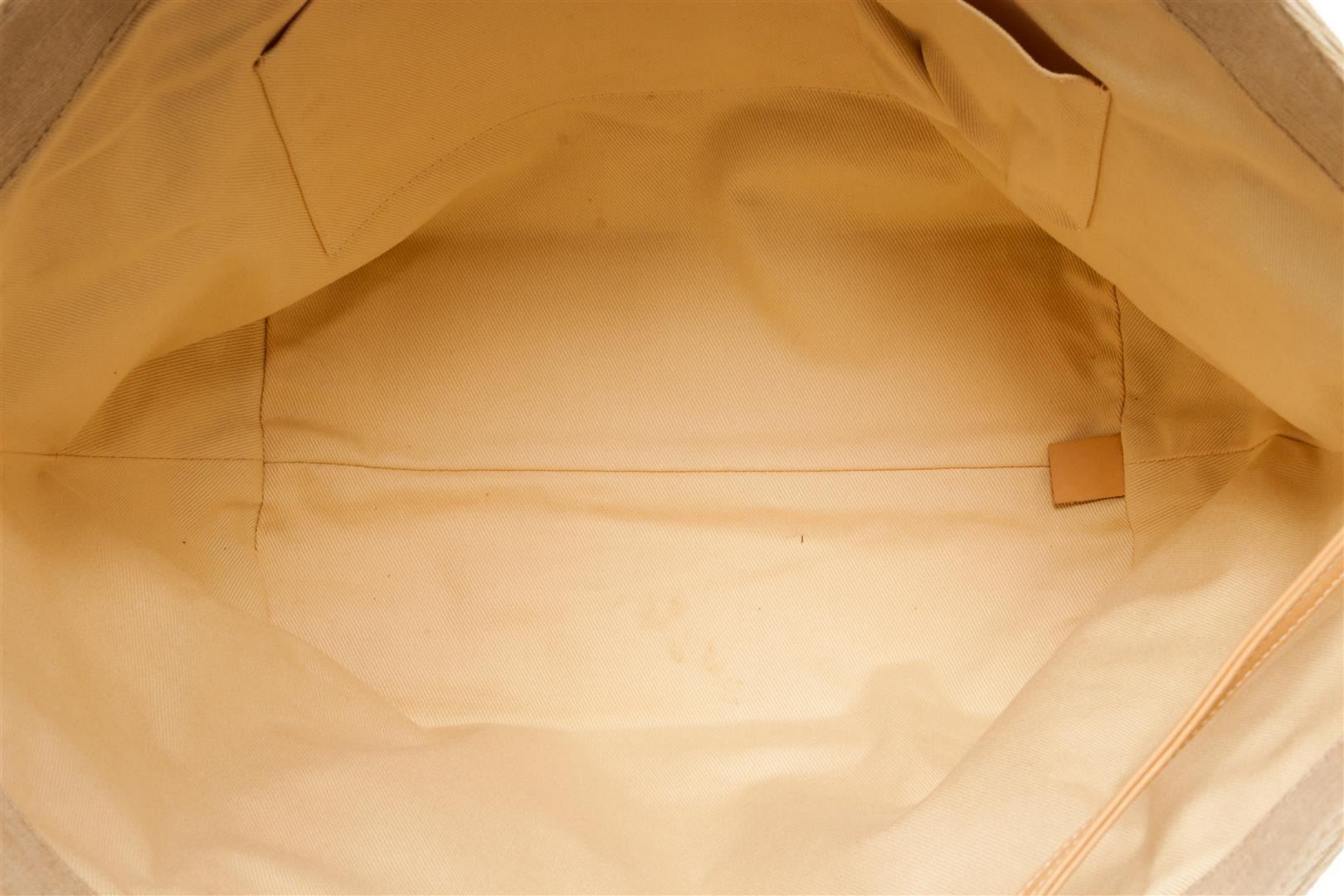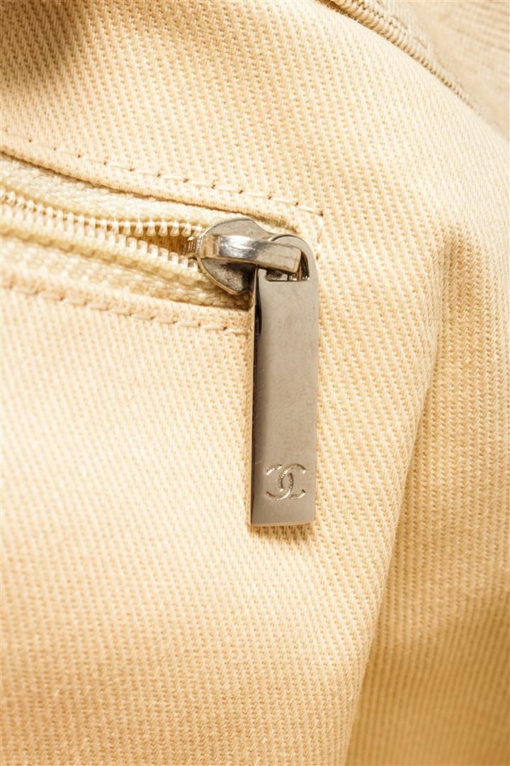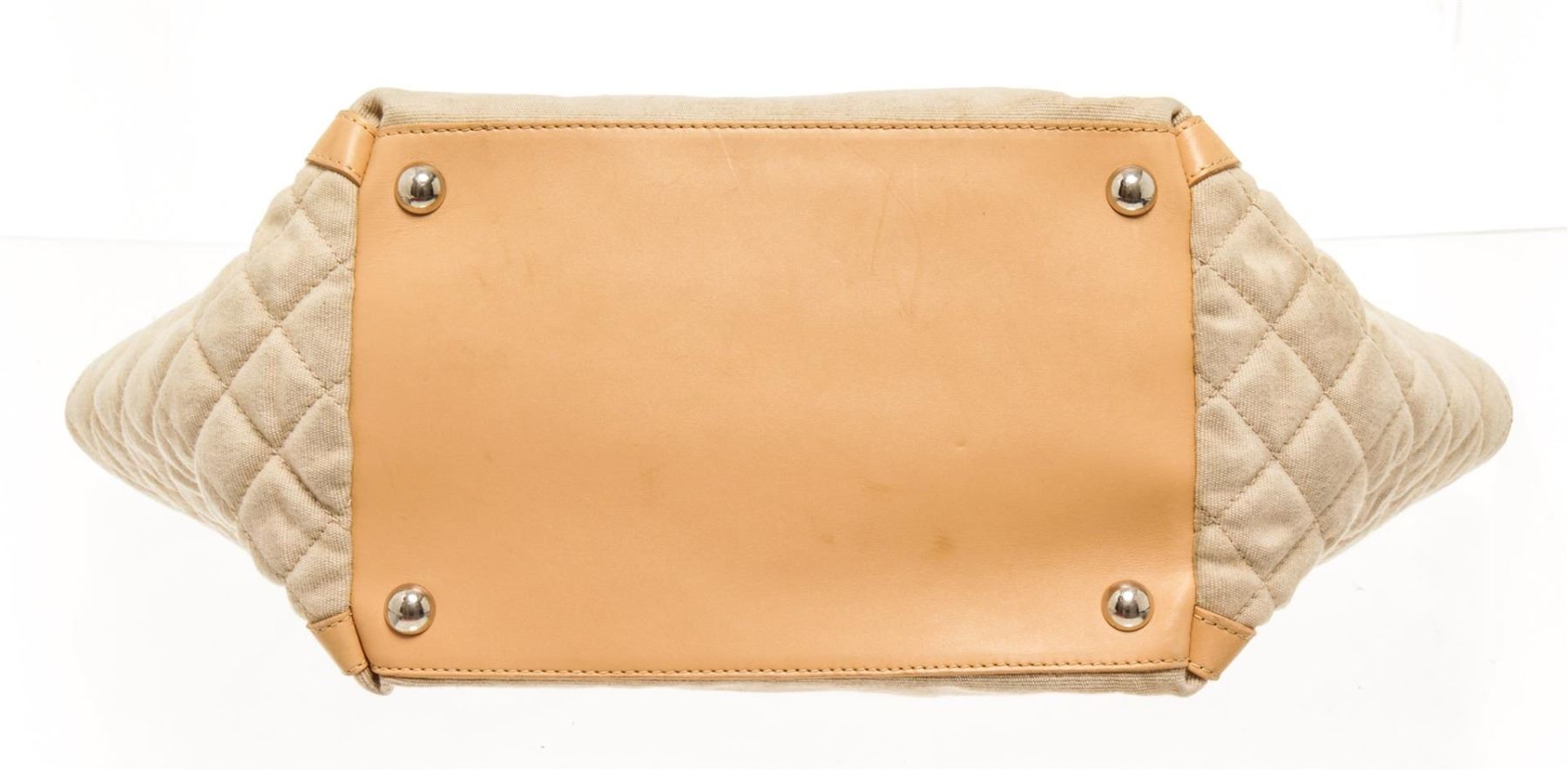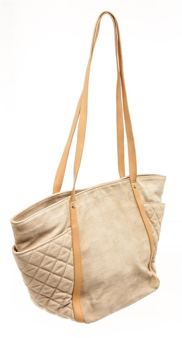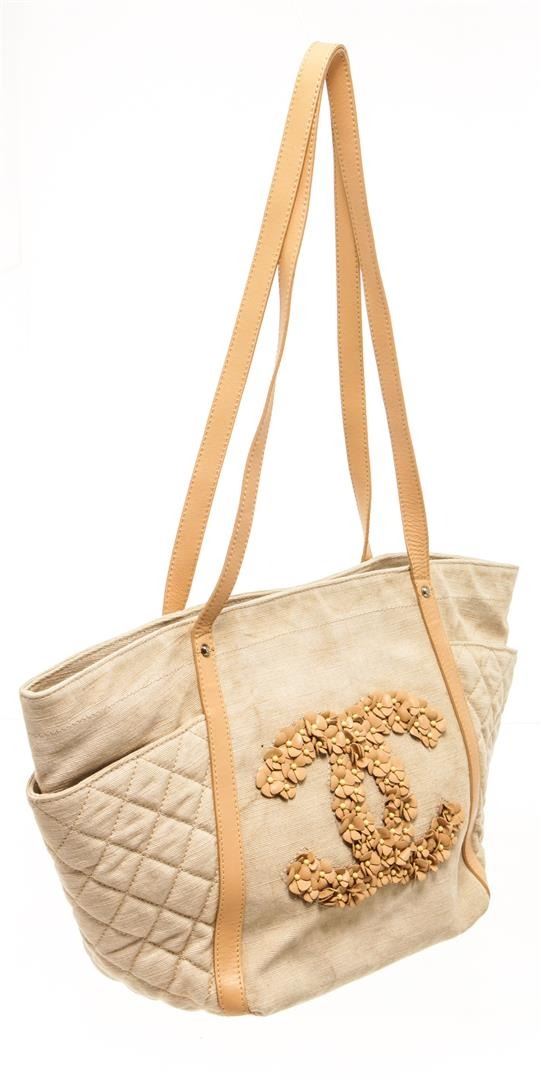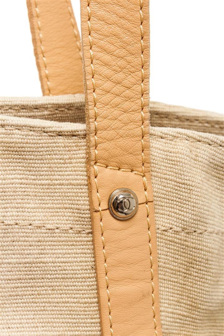 Chanel Beige Canvas CC Camelia Shoulder Bag. All available information is listed in the description and shown in the photos. Chanel beige canvas CC camelia shoulder bag with beige canvas exterior, beige leather straps, open top, silver-tone hardware, beige fabric lining, and two interior pockets: one zip, one slip. There are some stains on the exterior canvas as shown in pictures. Height: 11.81" Width: 20.47" Depth: 7.48", Shoulder Handle Drop: 15.35" / 30 x 52 x 19 Cm