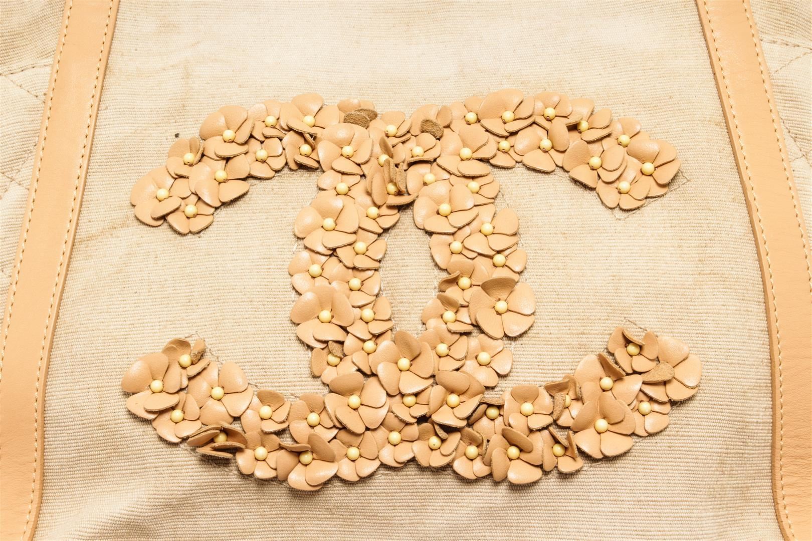 Chanel Beige Canvas CC Camelia Shoulder Bag. All available information is listed in the description and shown in the photos. Chanel beige canvas CC camelia shoulder bag with beige canvas exterior, beige leather straps, open top, silver-tone hardware, beige fabric lining, and two interior pockets: one zip, one slip. There are some stains on the exterior canvas as shown in pictures. Height: 11.81" Width: 20.47" Depth: 7.48", Shoulder Handle Drop: 15.35" / 30 x 52 x 19 Cm