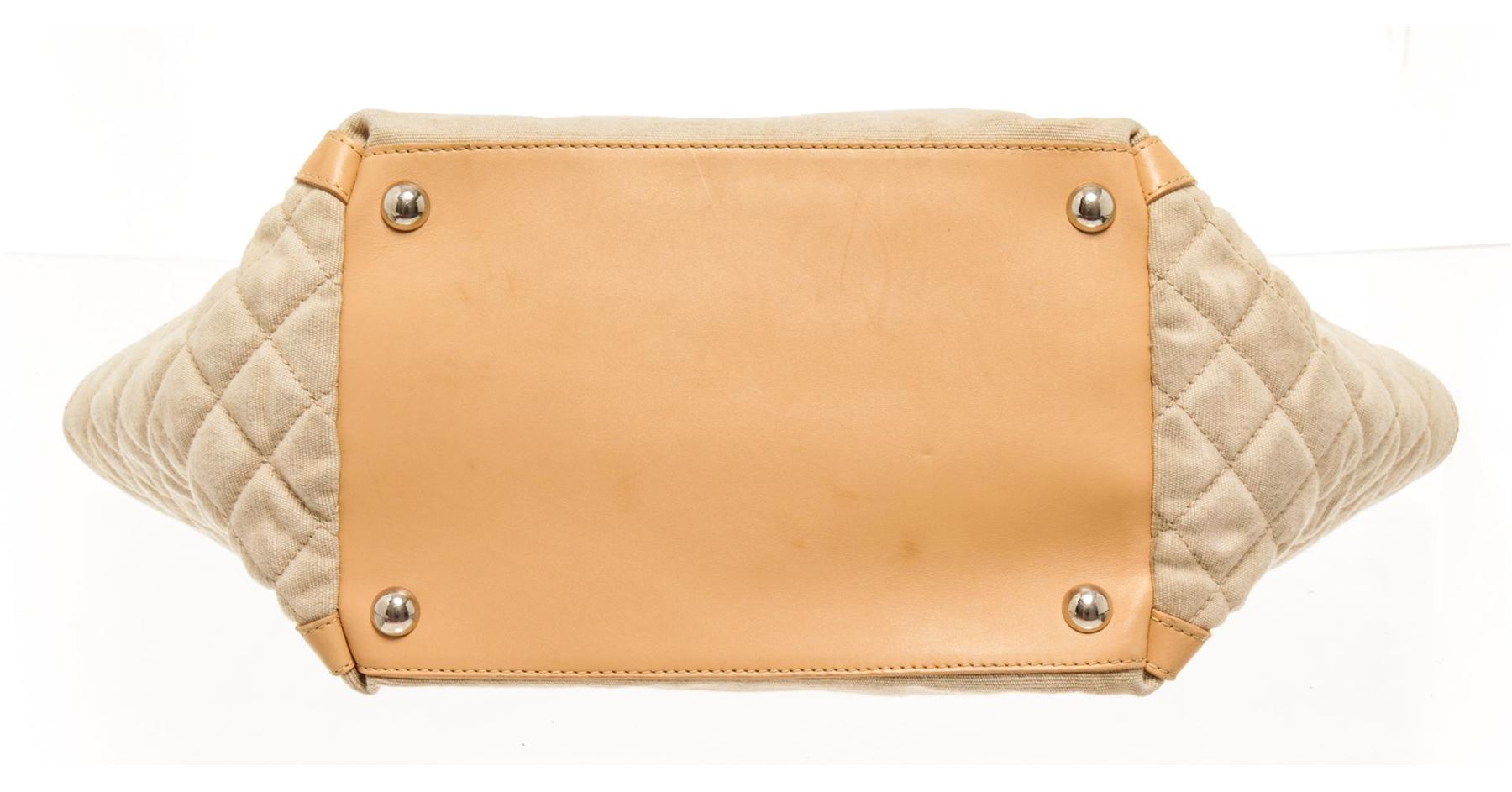 Chanel Beige Canvas CC Camelia Shoulder Bag. All available information is listed in the description and shown in the photos. Chanel beige canvas CC camelia shoulder bag with beige canvas exterior, beige leather straps, open top, silver-tone hardware, beige fabric lining, and two interior pockets: one zip, one slip. There are some stains on the exterior canvas as shown in pictures. Height: 11.81" Width: 20.47" Depth: 7.48", Shoulder Handle Drop: 15.35" / 30 x 52 x 19 Cm