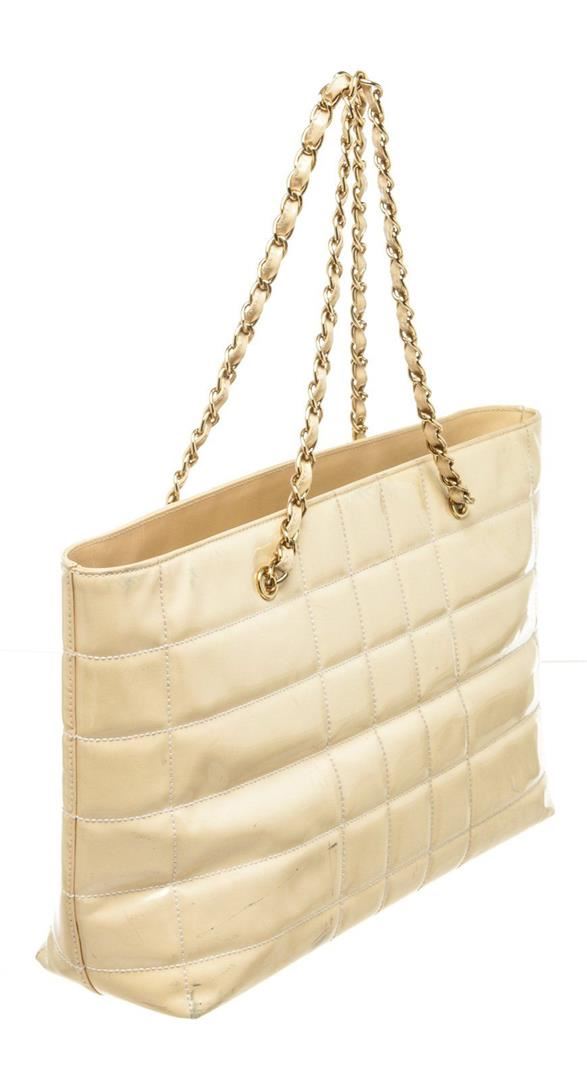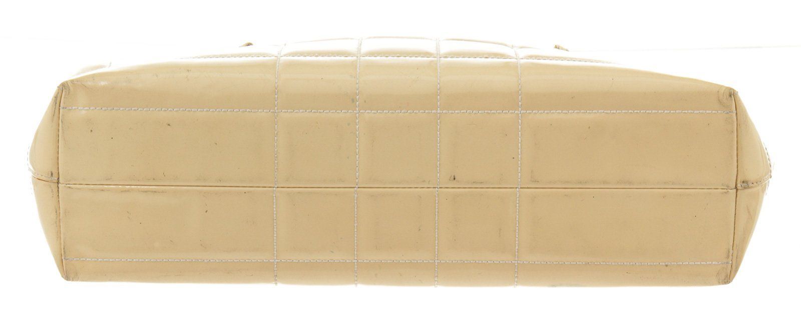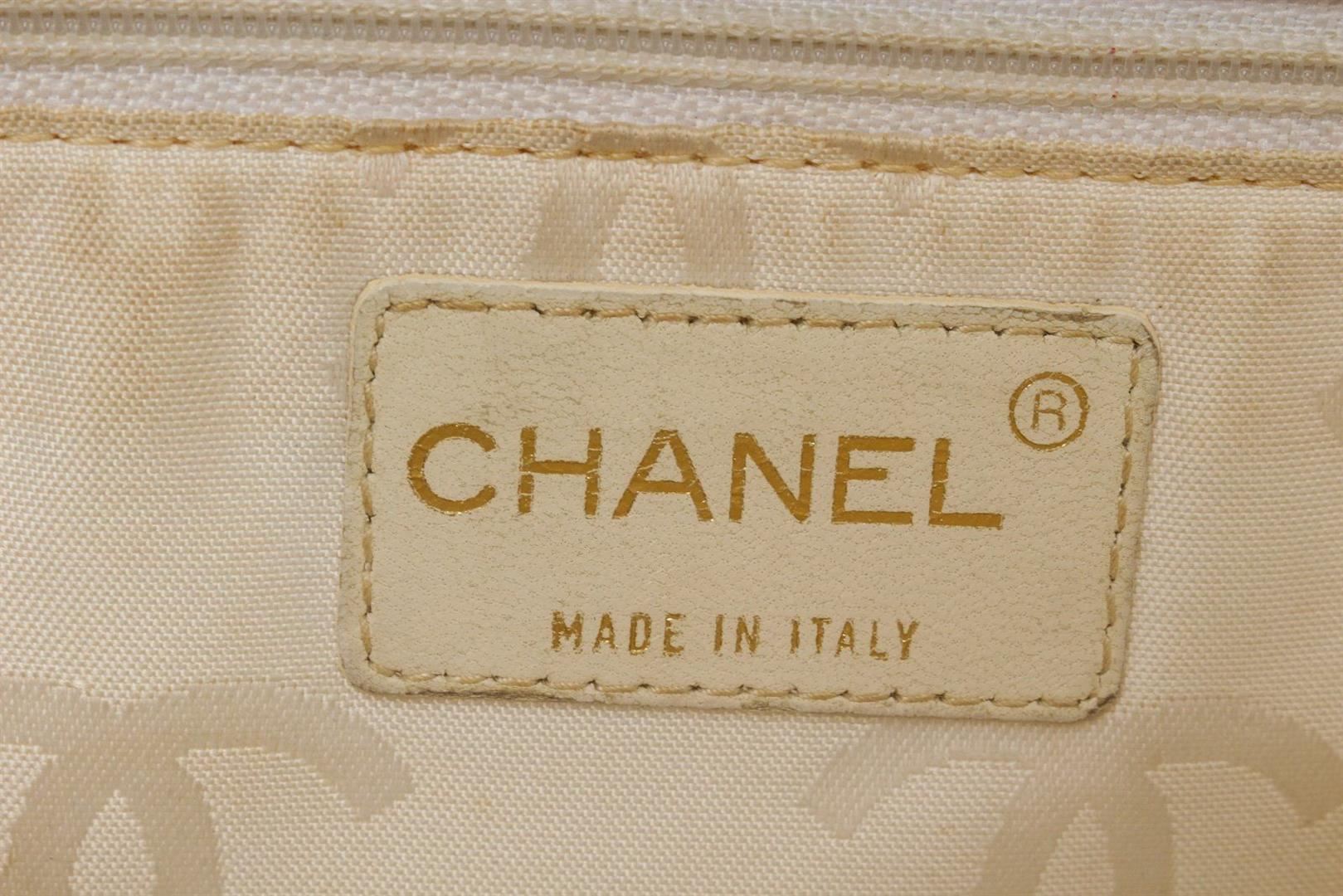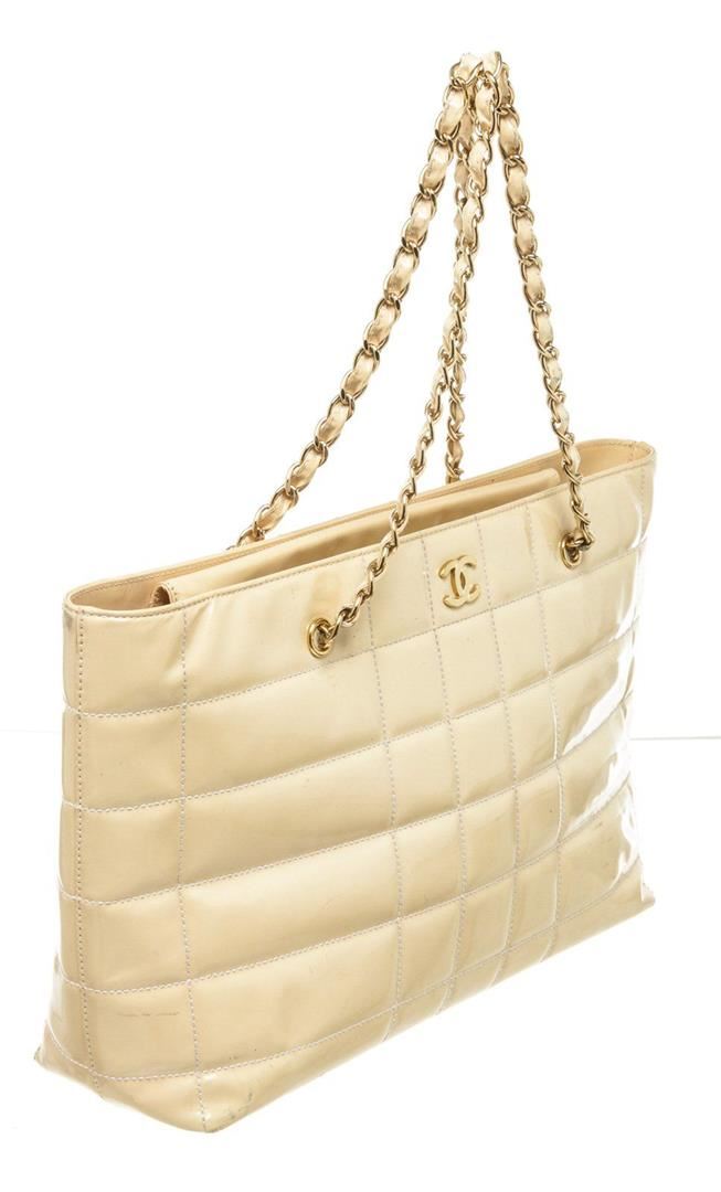 Chanel Beige Canvas Large Chocolate Shoulder Bag with leather, silver-tone hardware, interior zip pocket, shoulder strap and zipper closure.