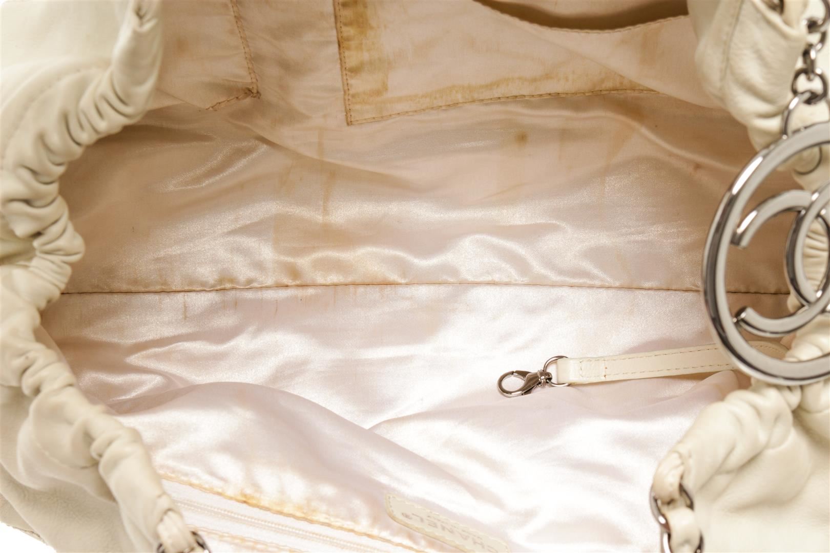 One Chanel Beige Leather Coco Cabas Tote Bag. Item is sold AS-IS. All available information is listed in the description and shown in the photo. Chanel beige leather Coco Cabas tote bag with relaxed beige leather exterior, with the bottom half having diamond-patterned stitching, silver-tone hardware, a CC logo, two top chain-link shoulder straps, beige satin lining, one interior zip pocket, and snap button closure. Corners are worn, fabric lining is very stained. Please refer to photos.