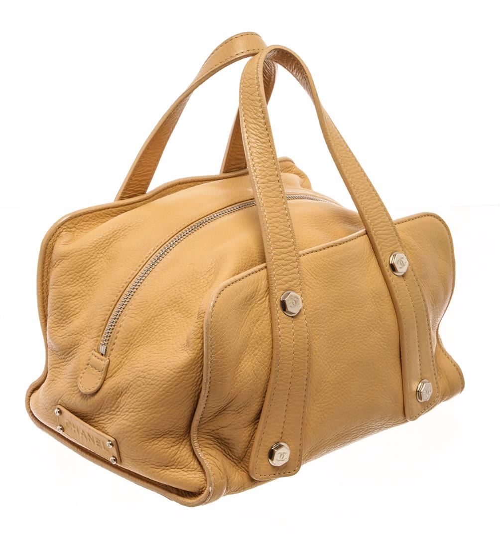 Chanel Beige Leather Deerskin Medium Shoulder Bag. All available information is listed in the description and shown in the photos. Chanel Beige Leather Deerskin Medium Shoulder Bag with beige deerskin leather top handles, fabric Chanel lining, silver tone hardware, zipper closure. There are some stains on the lining. Please refer to photos. length: 11.25 in, Height: 7 in, Width: 7.75 in / 28.57 X 17.7 X 19.68 CM