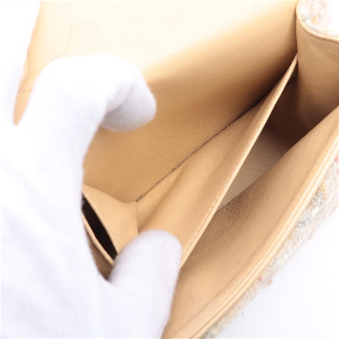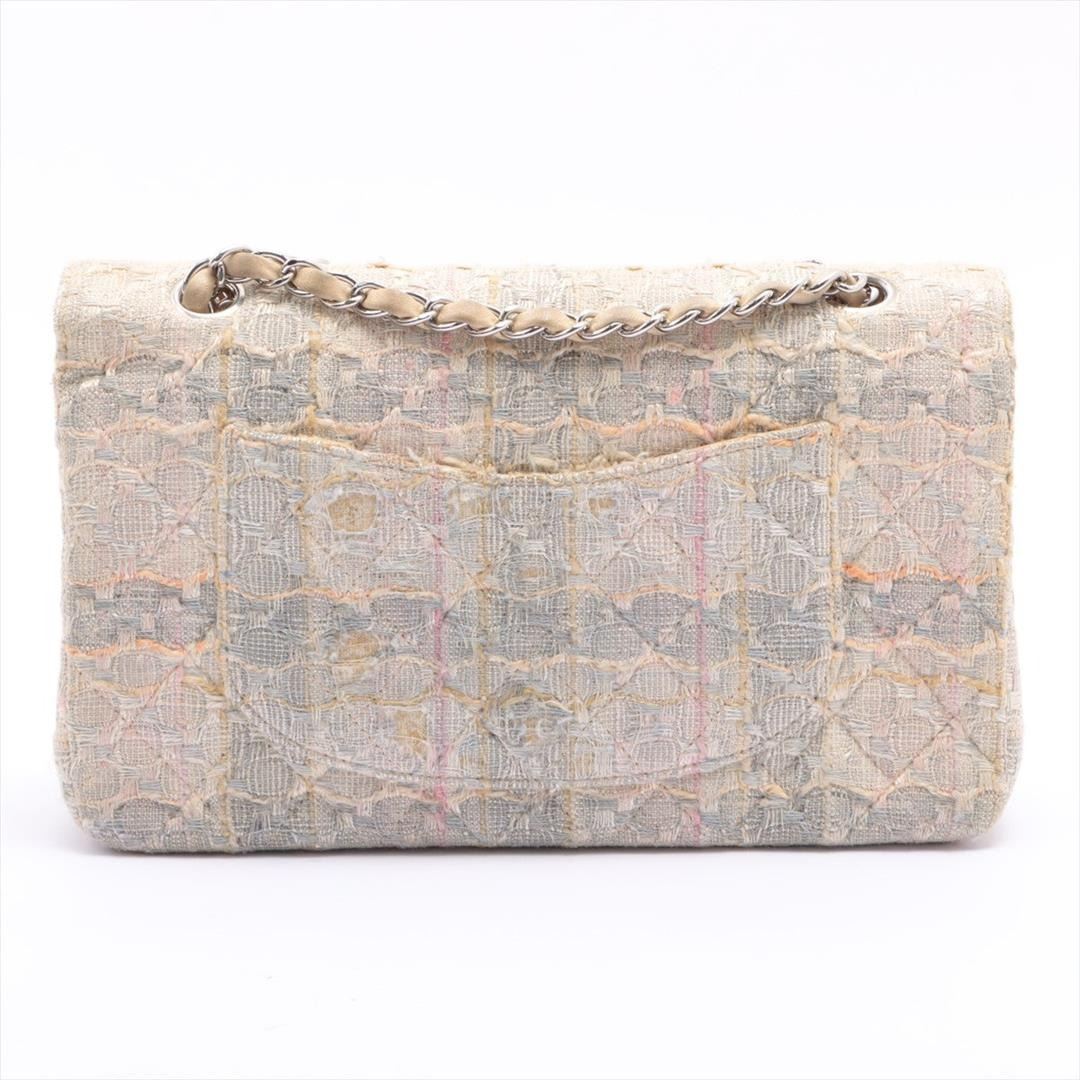 This Chanel double flap bag is crafter in beige and multicolor Boucle quilter tweed with a silver-tone CC turnlock closure, silver-tone doubleable chain shoulder strap, and one exterior rear slip pocket. The interior is crafter in beige leather and featur