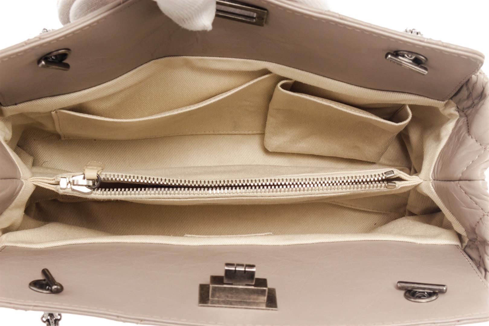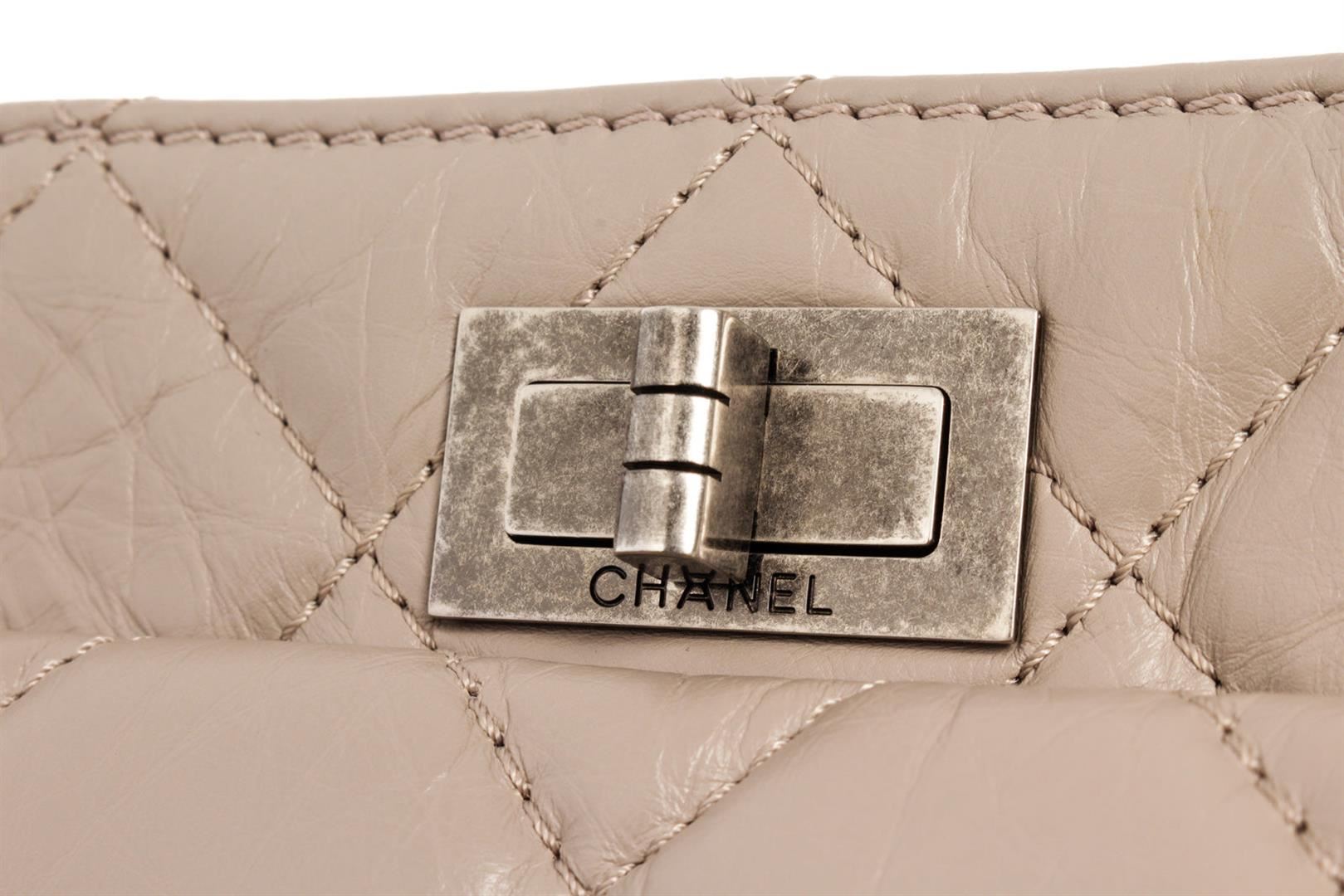Beige quilted Lambskin leather Chanel 2.issue Grand Shopping tote bag with silver-tone hardware, two outer flat pockets, double Reissue chain shoulder straps, protective feet at base, Chanel Mademoiselle turn-lock closure at top that will open to beige ca